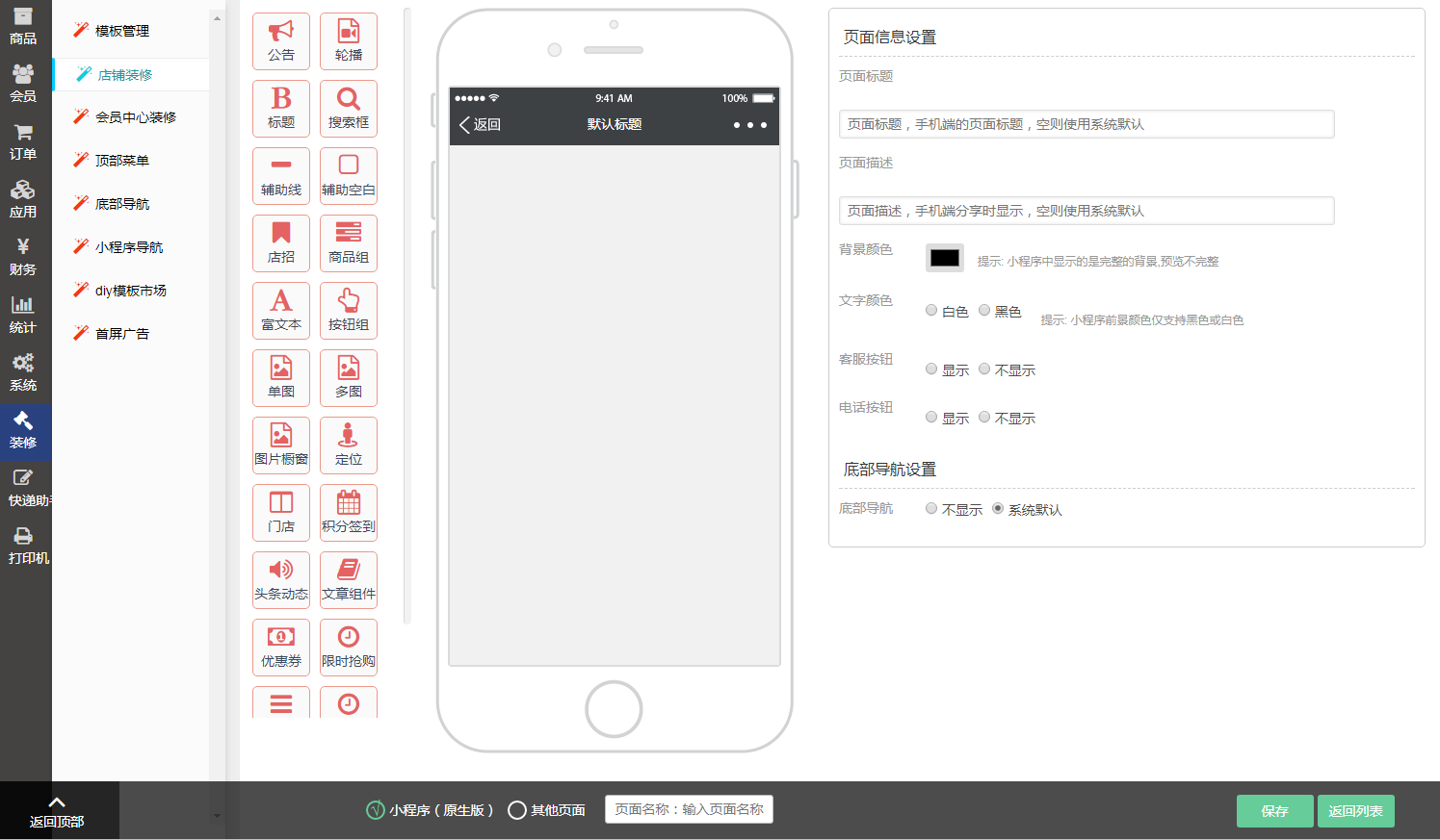 ## 第二步、原生小程序店铺装修操作方法: 应用–工具类–店铺装修–小程序(NATIVE),如下图: