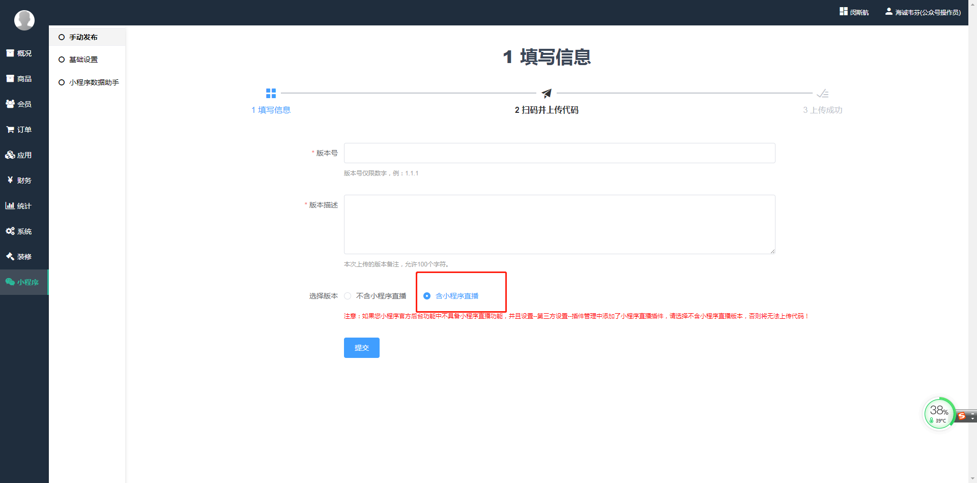 ## 注:如果您小程序官方后台功能中不具备小程序直播功能,并且设置–第三方设置–插件管理中添加了小程序直播插件,请选择不含小程序直播版本,否则将无法上传代码!若已具备小程序直播功能,记得选择含小程序直播。