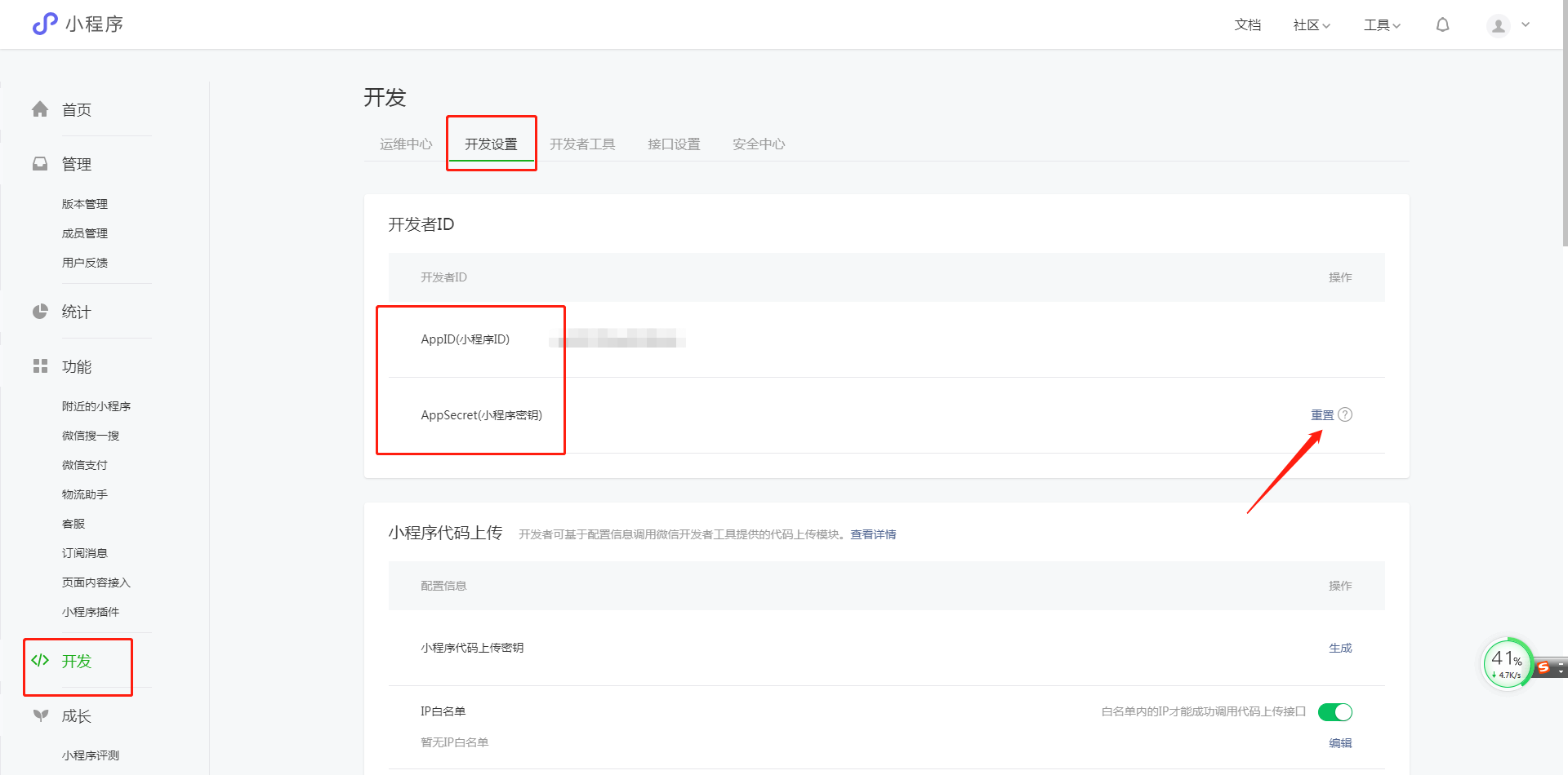## 2、APPID和其秘钥在小程序后台**开发 — 开发设置**中可以找到,后台截图: