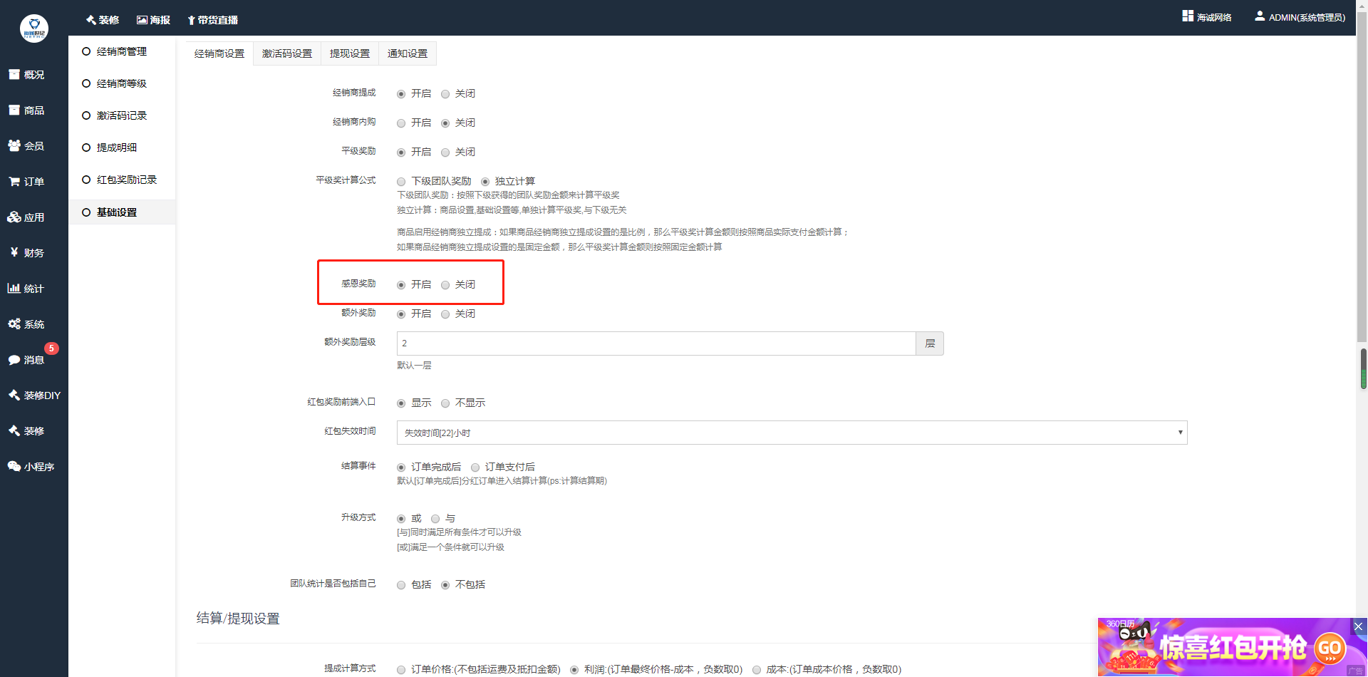 ## **经销商设置——感恩奖励——开启**