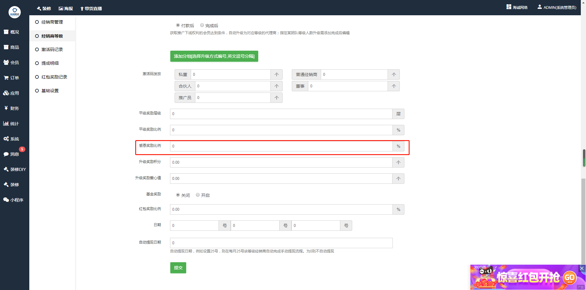 ## 开启后,经销商可以获得感恩奖励(获得下级经销商提成的百分比)