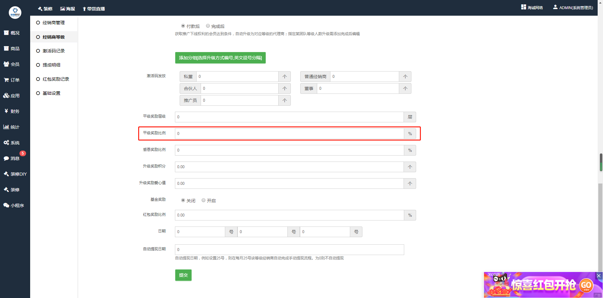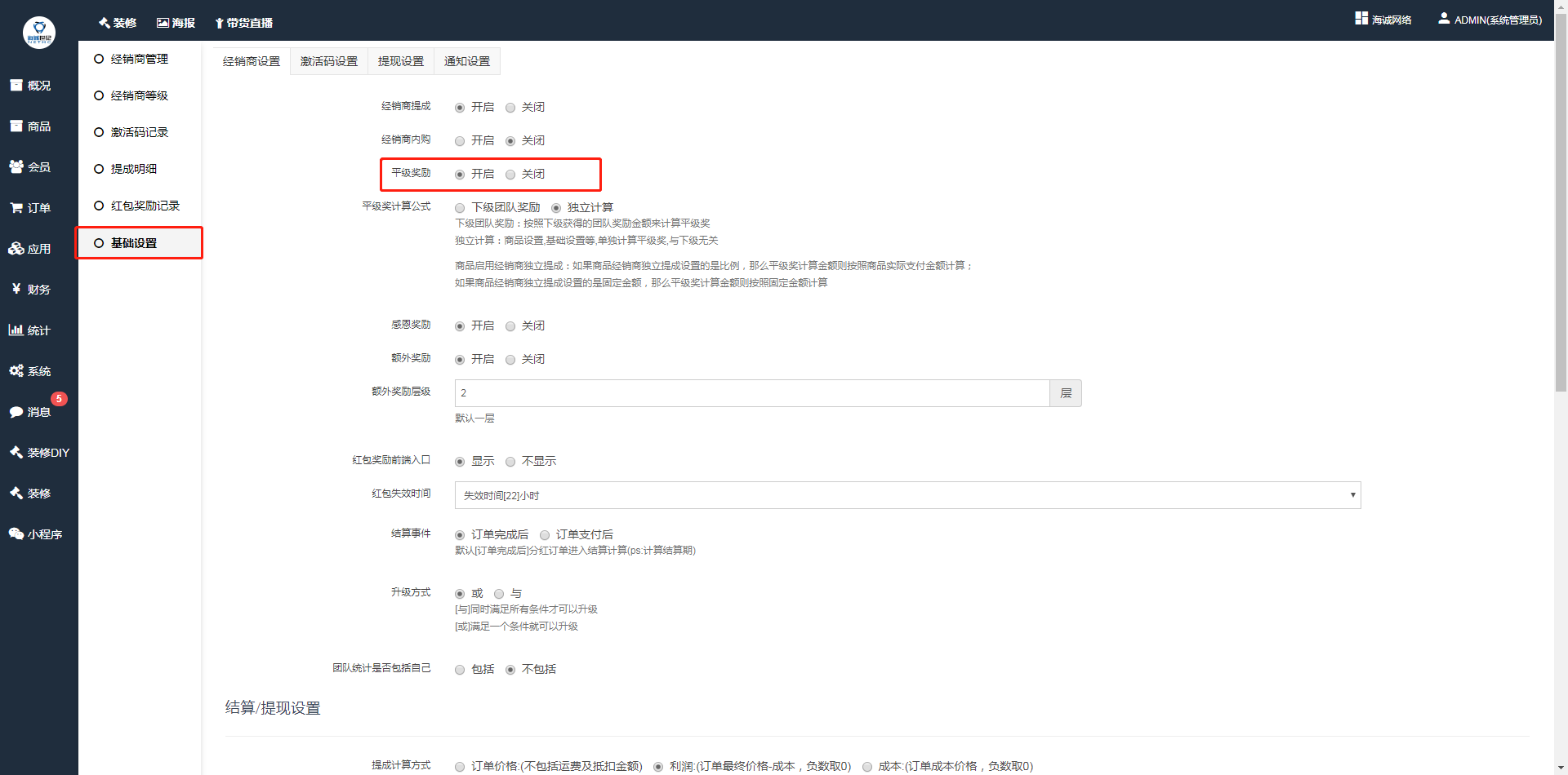 ## **经销商设置——平级奖励——开启**