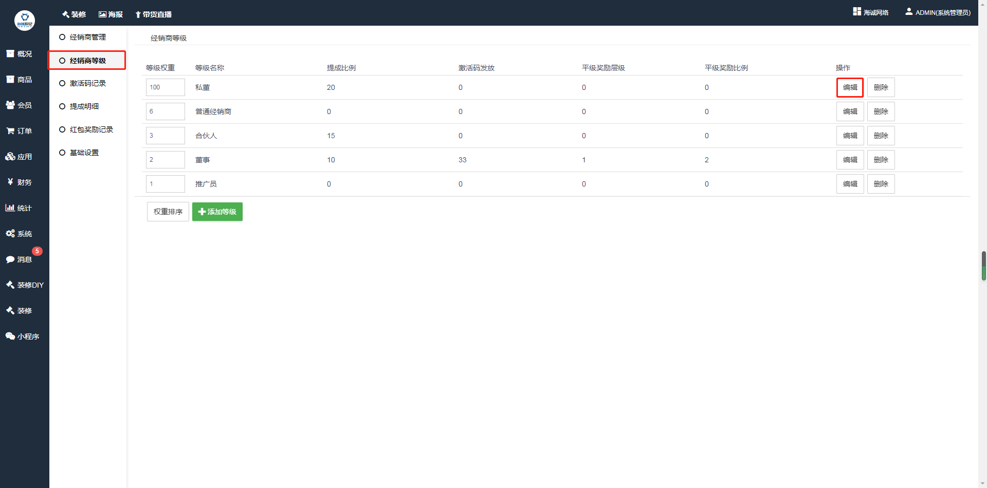 ## 经销商等级——选择要设置经销商平级奖的经销商等级——点击编辑