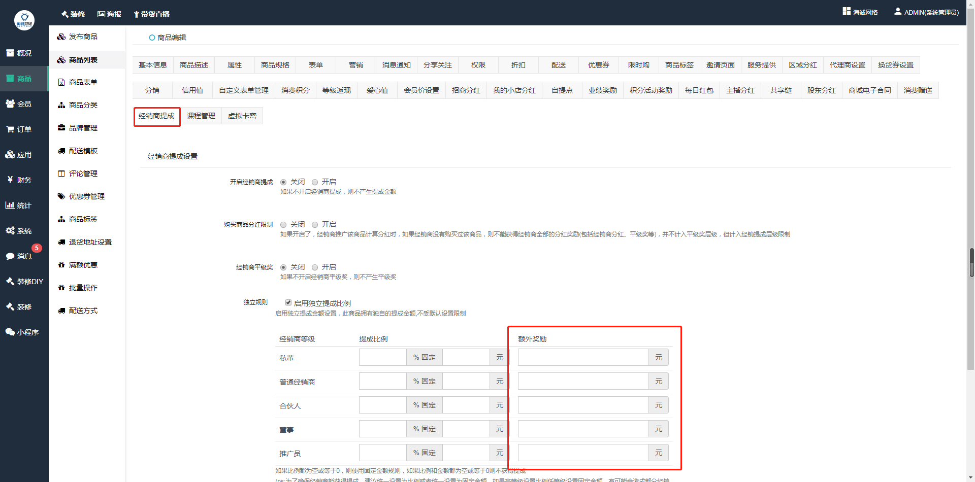 ## 2.经销商额外奖励的金额设置需要到到单商品的经销商提成处设置