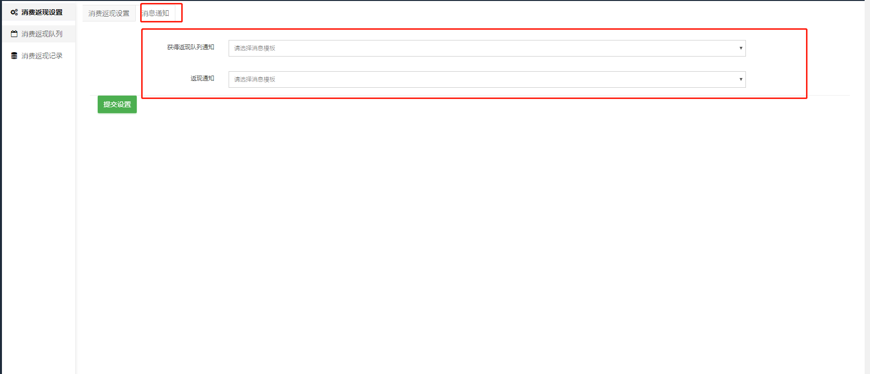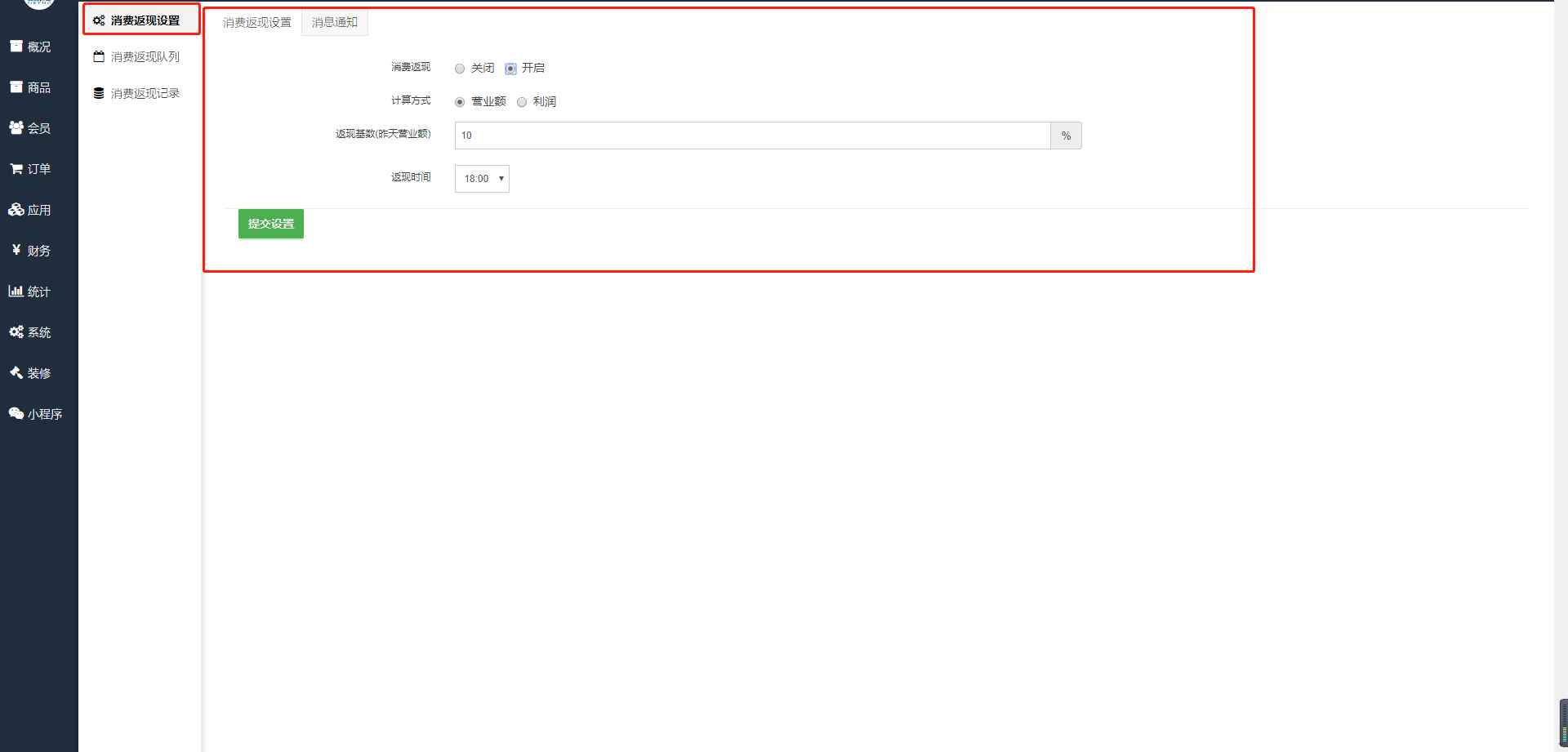 ## 在消费返现插件--消费返现设置中,开启消费返现,设置计算方式为营业额或者利润,设置返现基数,返现时间等