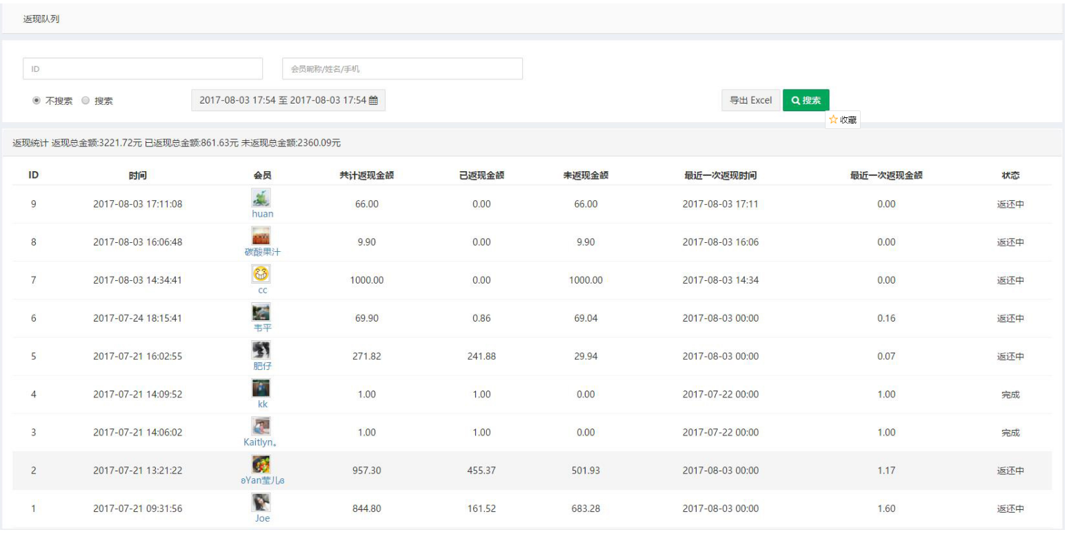 ## 1、消费返现队列(消费返现插件--消费返现队列):记录会员返现情况,方便商家查看统计