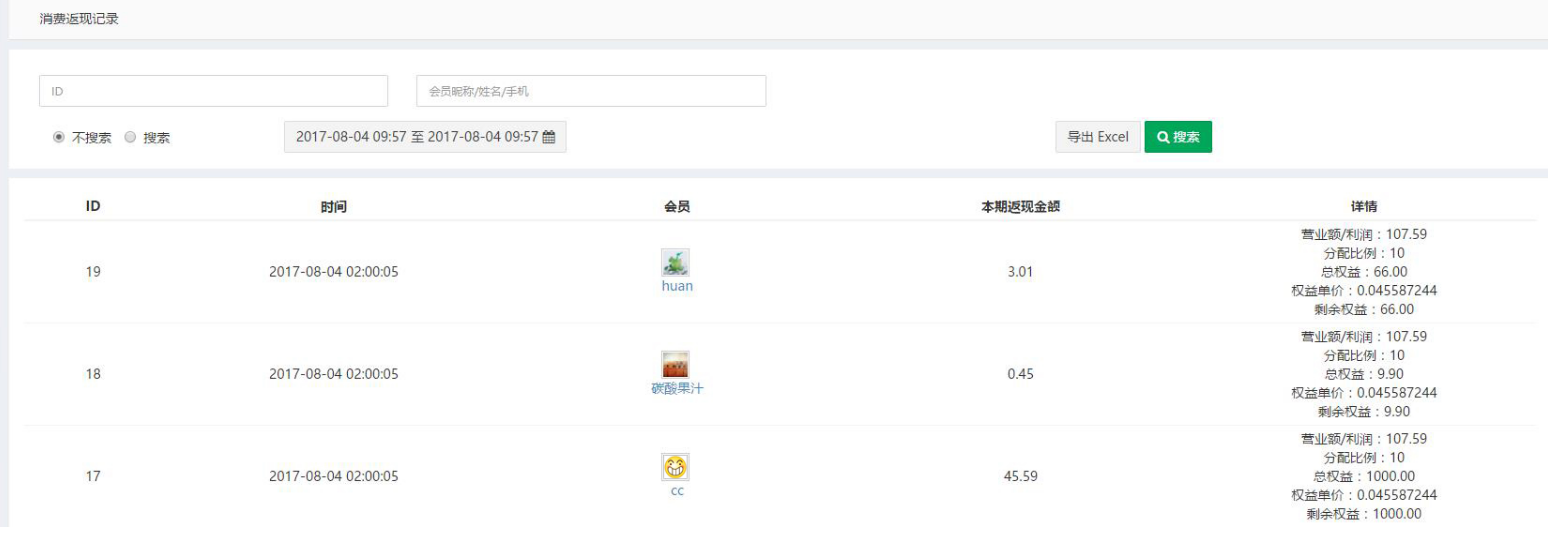 ## 2、点击导出Excel即可导出消费返现记录列表信息