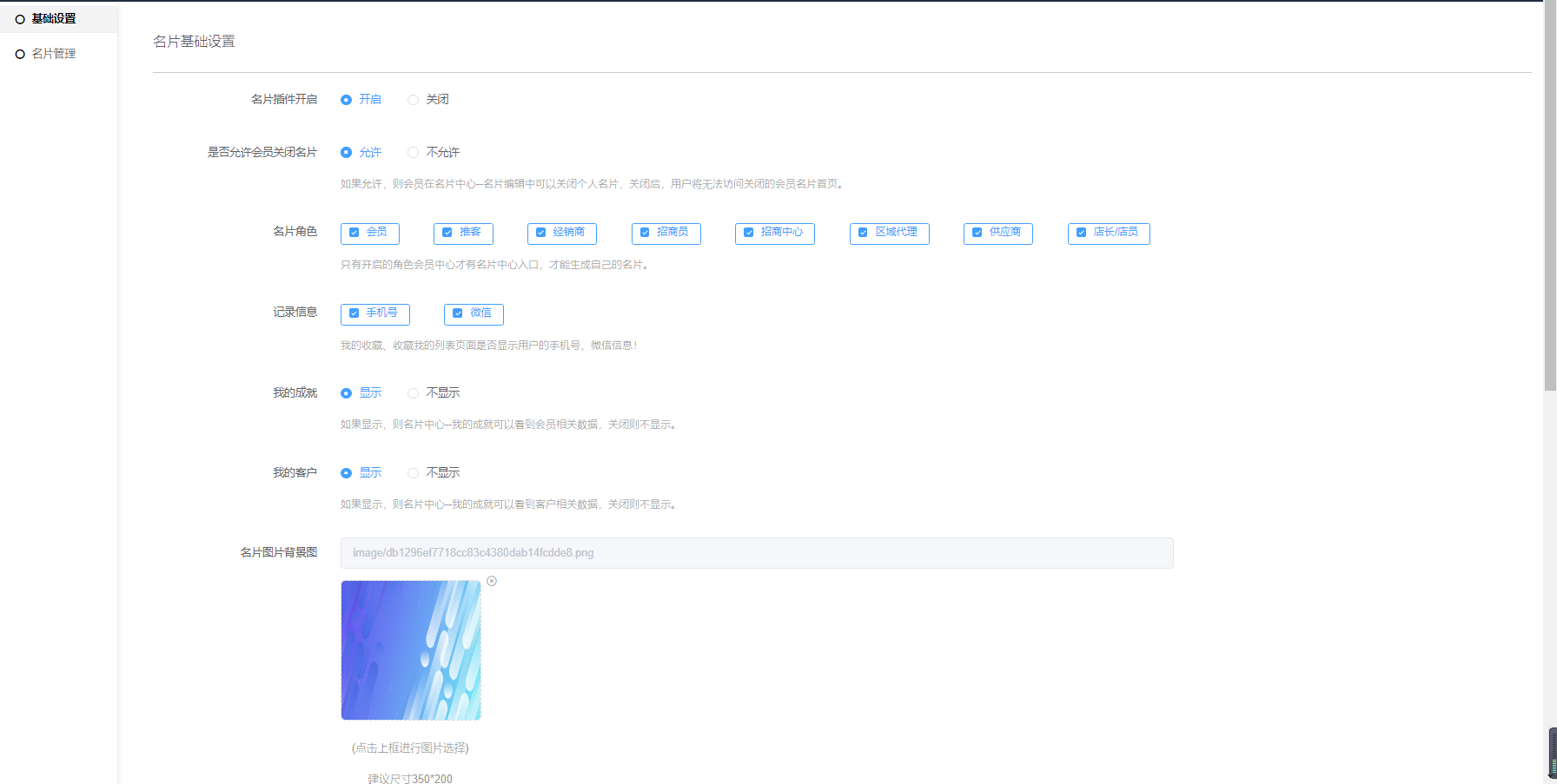 #### 名片基础设置。根据自身需要开启或勾选功能即可。
