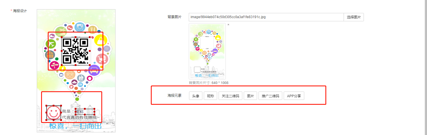 #### 注意:在设计海报底图时,海报底图需要预留出放头像和二维码的位置。**