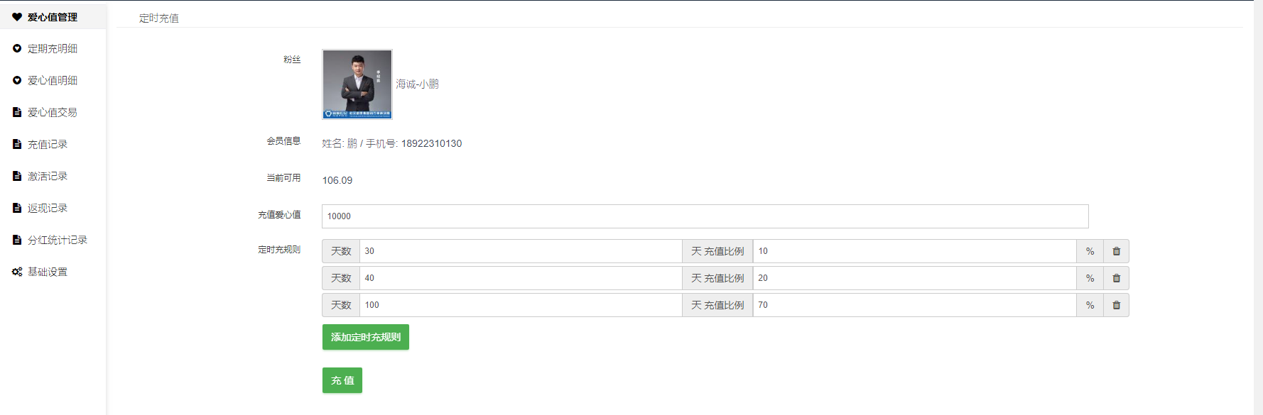 #### 定期给会员充值爱心值;比如充值爱心值10000,定时充值设置为天数30天 ,充值比例10%;天数40天充值比例20%;天数100天充值比例70%;那么将会在发起充值后30天自动充值10000*10%=1000爱心值;充值后40天后自动充值10000*20%=2000爱心值;充值后100天自动充值10000*70%=7000爱心值。【注意:若设置多个充值比例,比例总计不能超过100%】