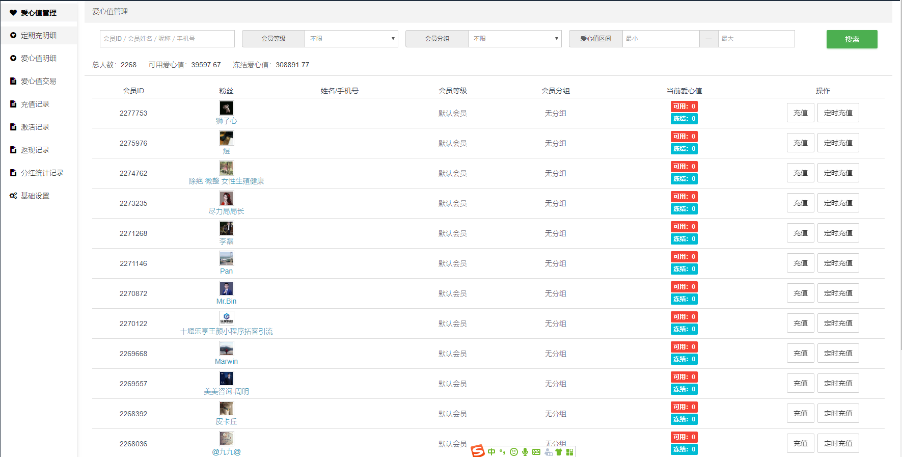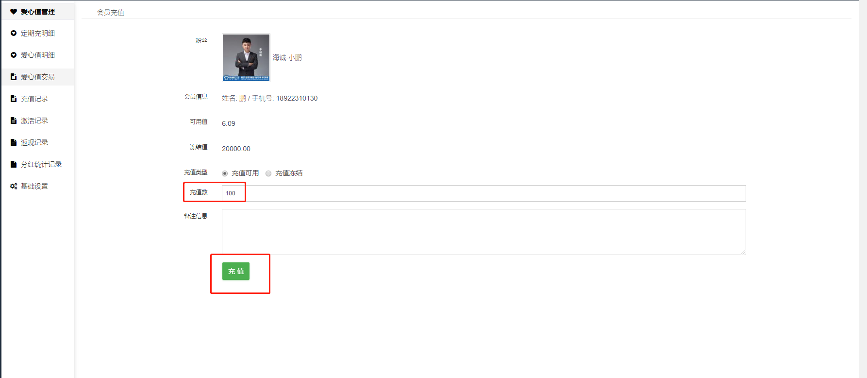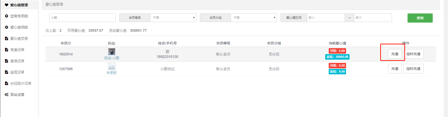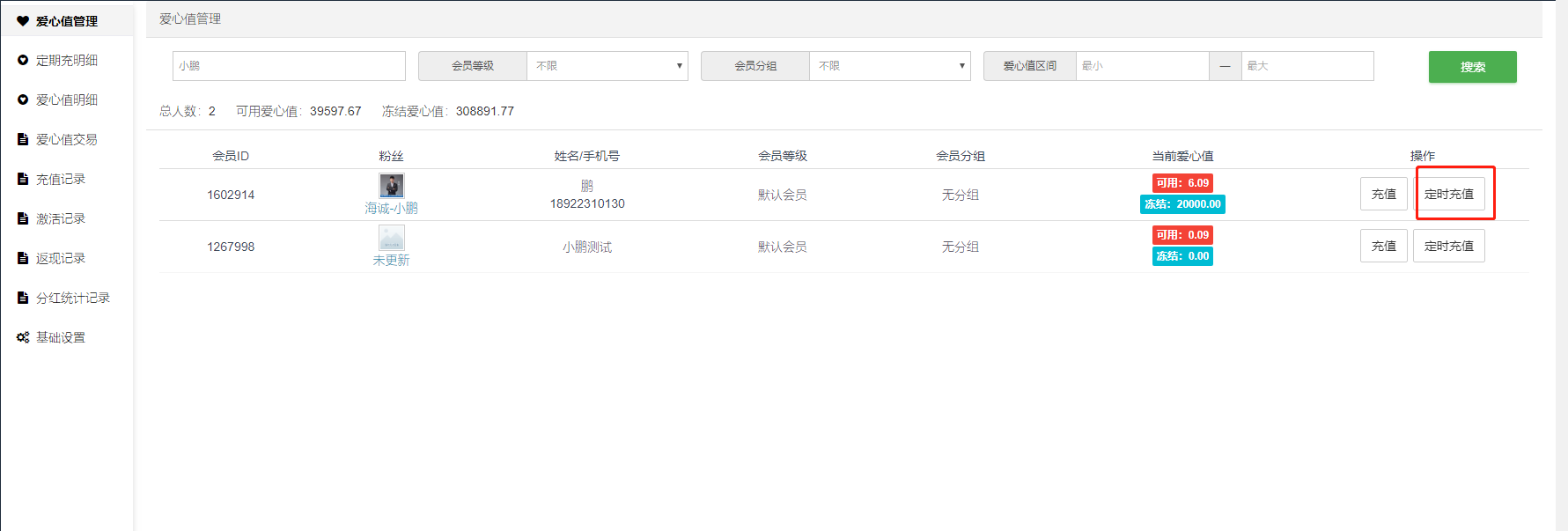#### 可在此给会员在后台手动充值爱心值或者给会员设置定时充值爱心值。