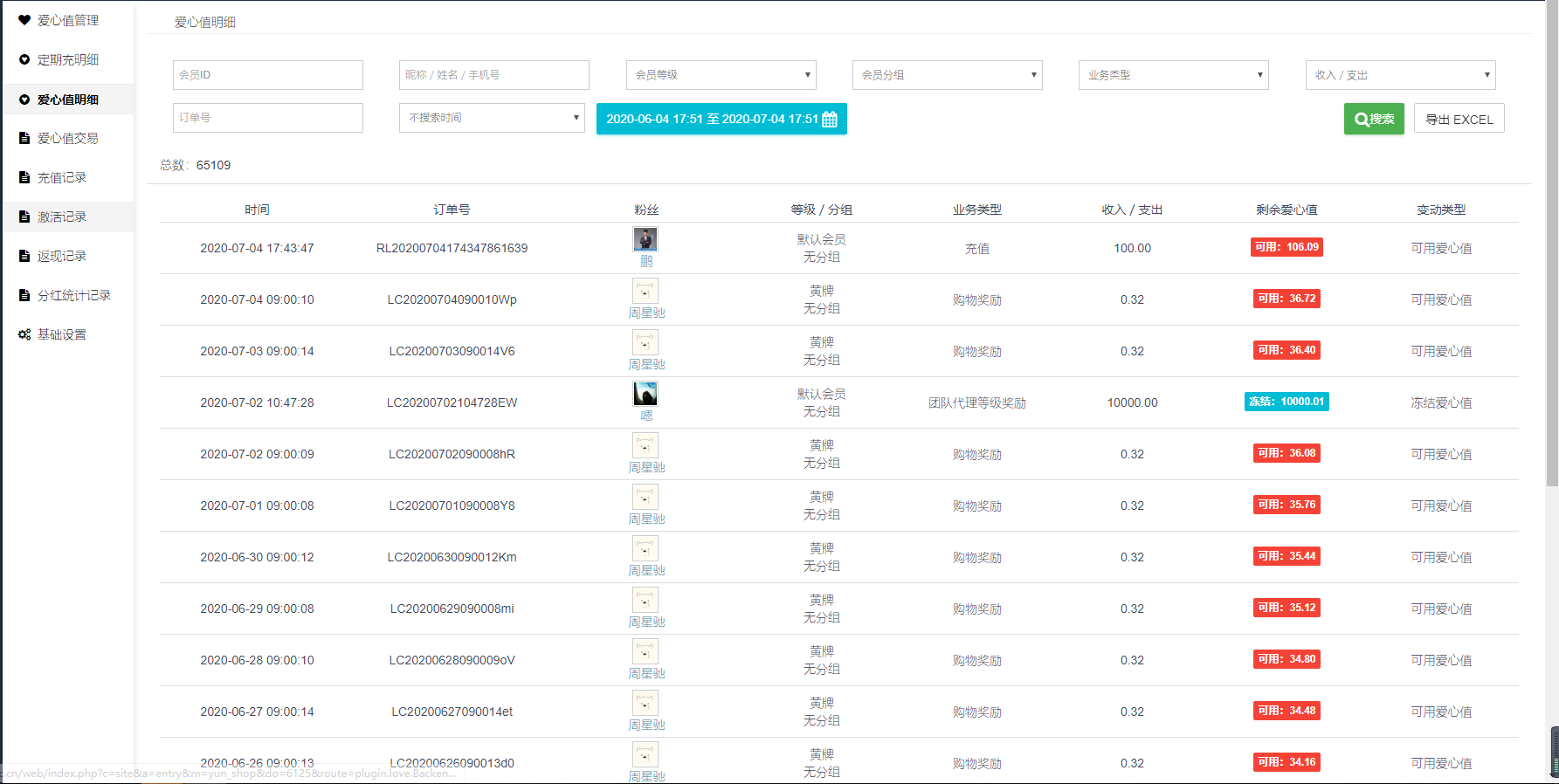 #### 会员账上的爱心值数量明细以及什么方式获得的爱心值都可在此查询。