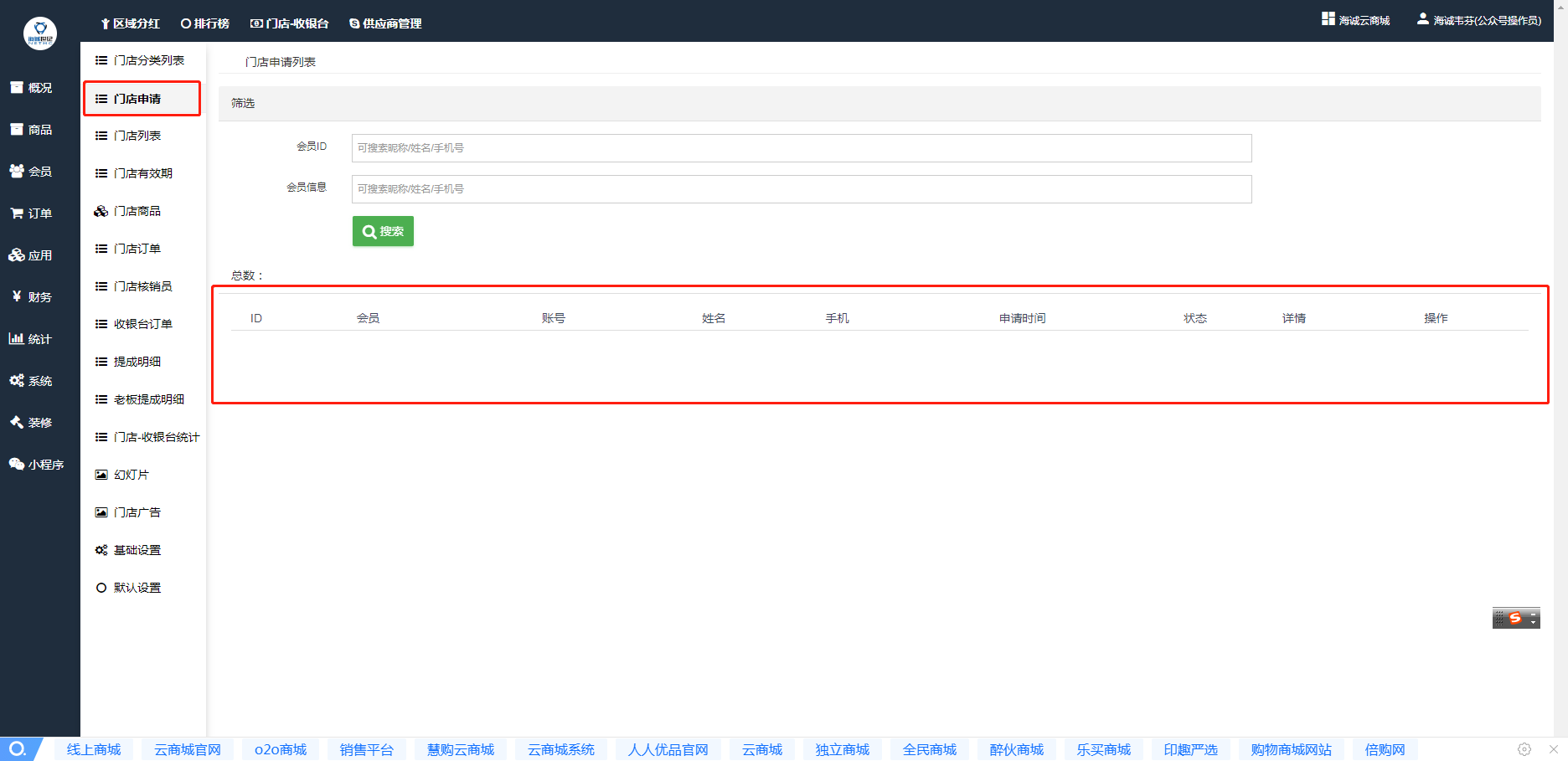 ## 在会员中心找到门店申请,填写完对应的信息即可提交门店申请,门店申请支持会员ID,会员昵称/姓名/手机号来搜索,后台截图: