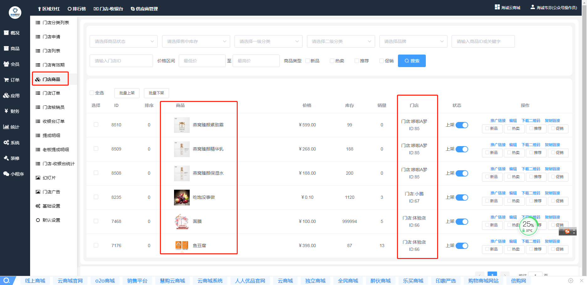 ## 门店商品列表中,可以直接看到所有门下店面的商品信息,比如价格、是否上架以及对商品进行编辑等等,后台截图: