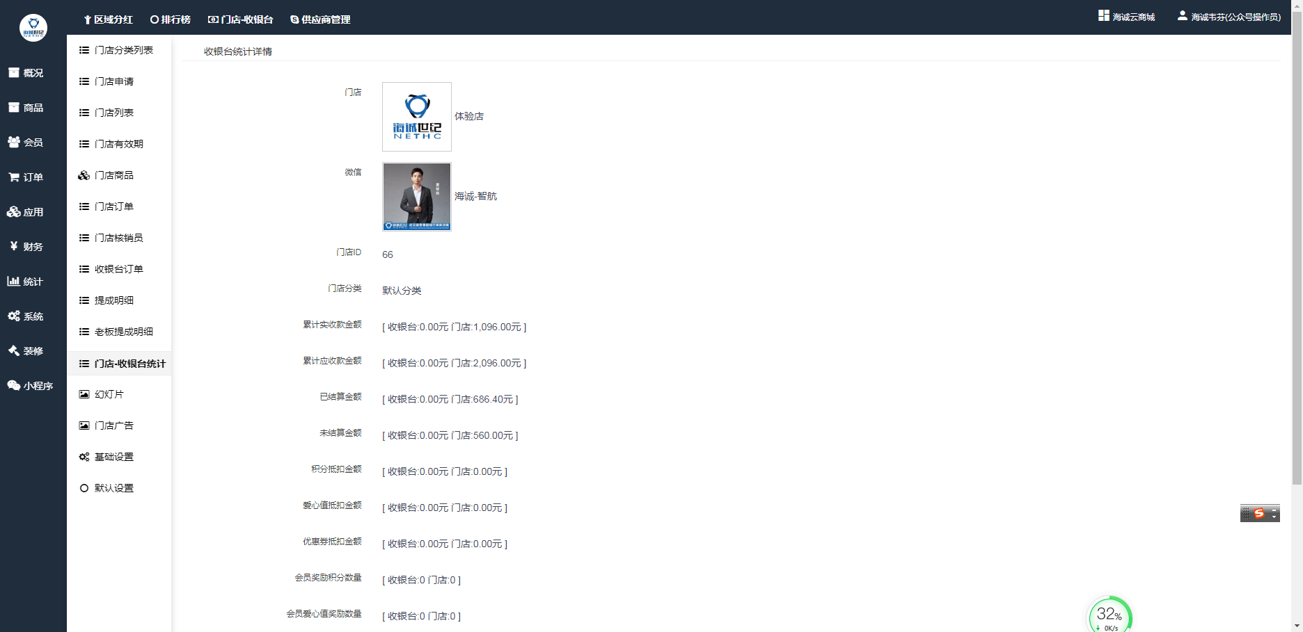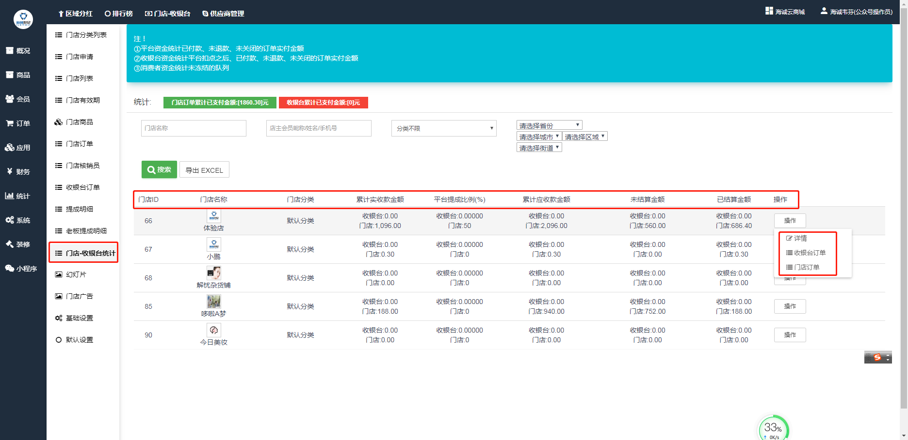 ## 门店收银台统计中可以查看到所有门店的运营详情,包括实收款、已结算、未结算等,后台截图: