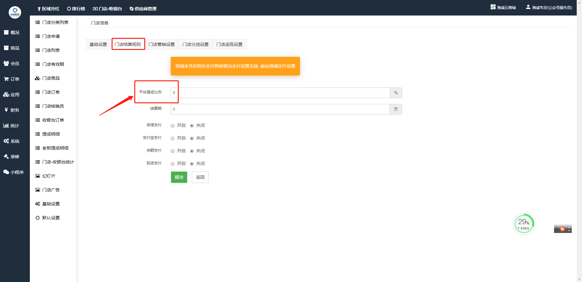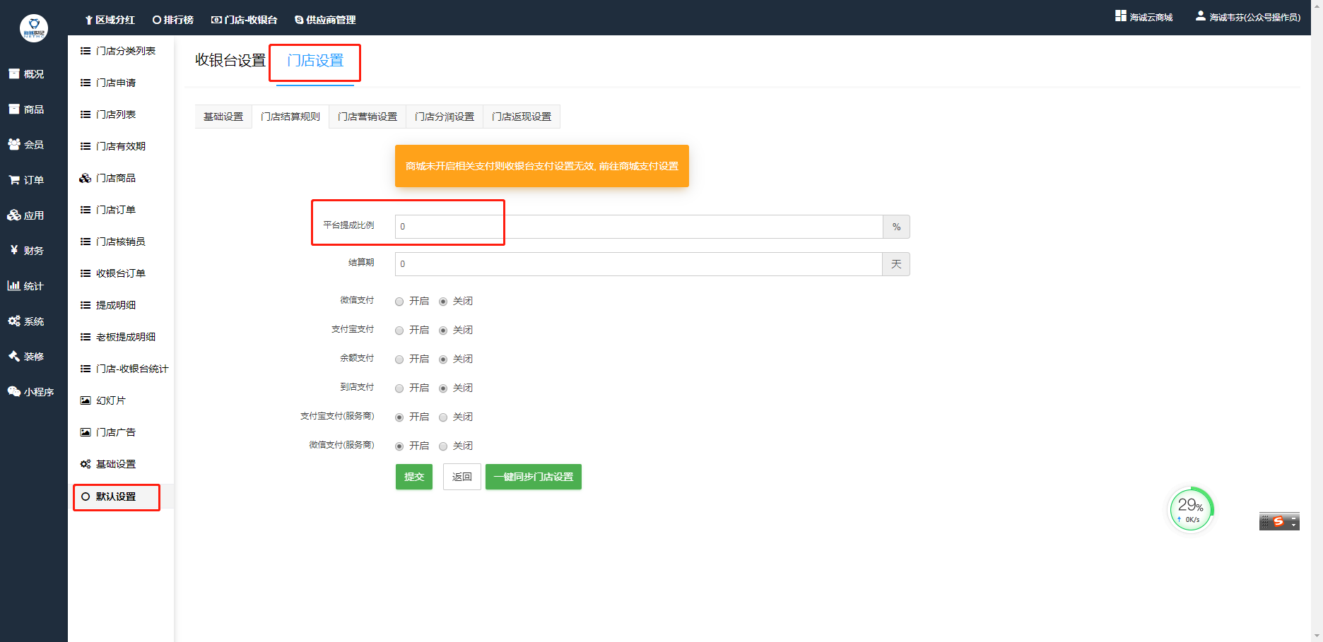 ## 可以在默认设置里设置好所有门店的提成比例(注:设置后只对新申请的门店生效)