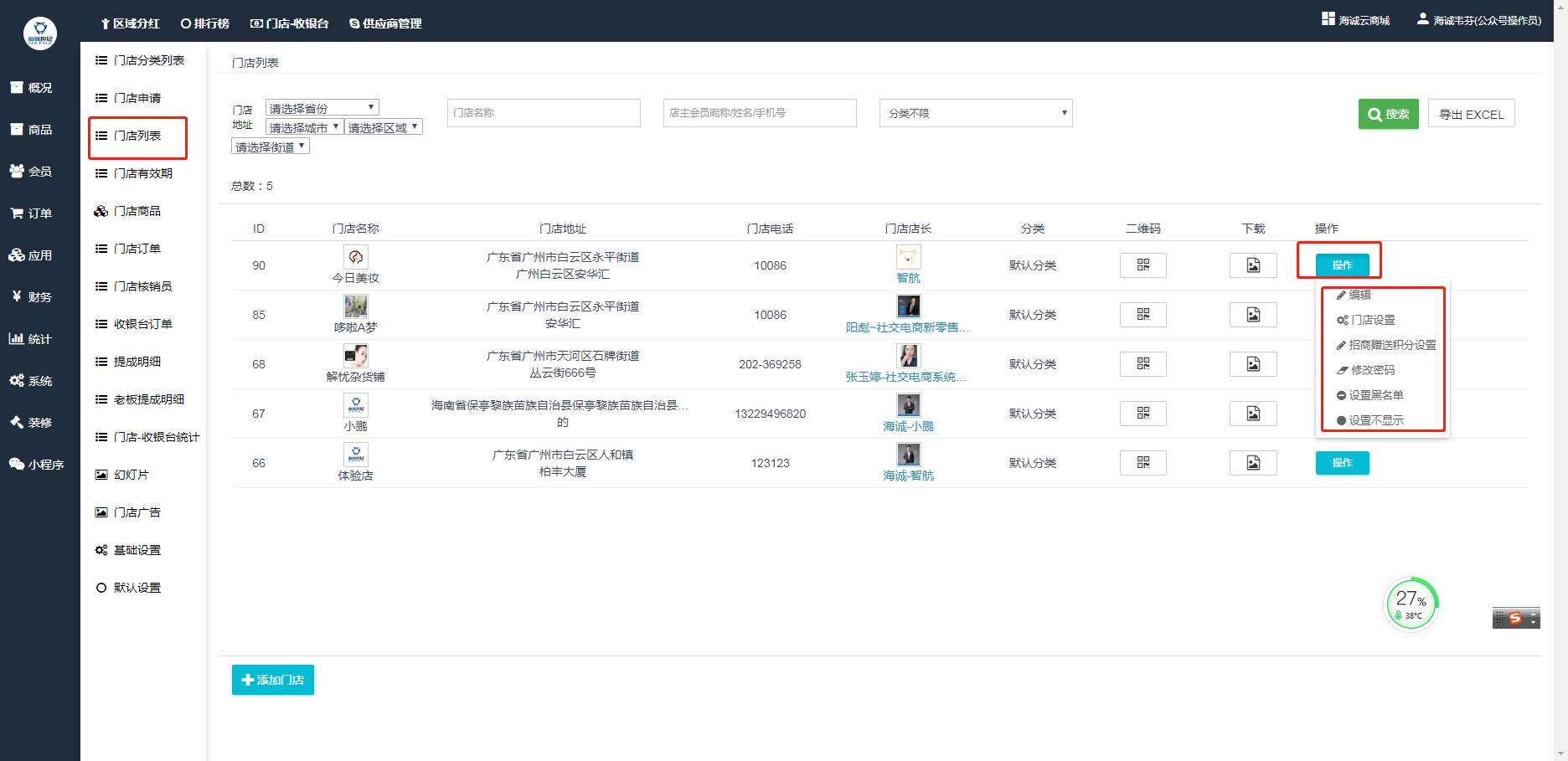 ## 商家在门店管理列表页面中,可查看到供应商专属ID、用户名、姓名以及联系方式。每个门店后有一个“操作”按钮,点击可查看供应商详细信息、修改门店登录后台的密码等