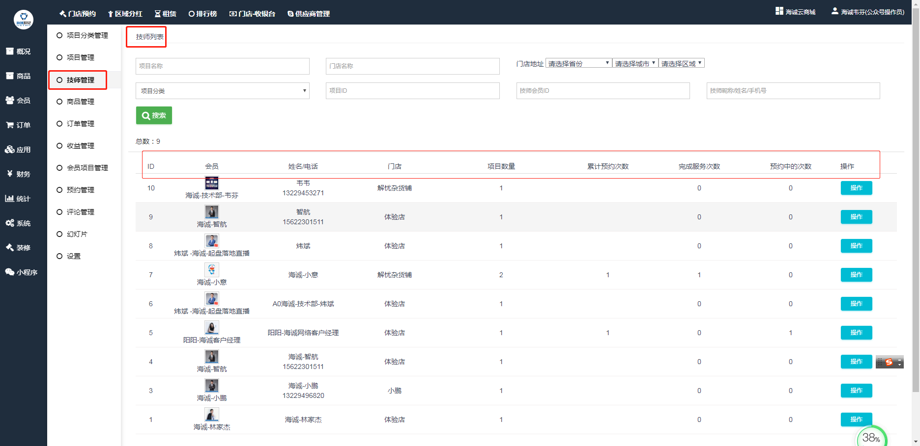 ## **门店预约—项目管理**中可查询到每一个技师的信息信息,比如属于哪个门店,项目数量、累计预约次数已经他们的联系方式等。