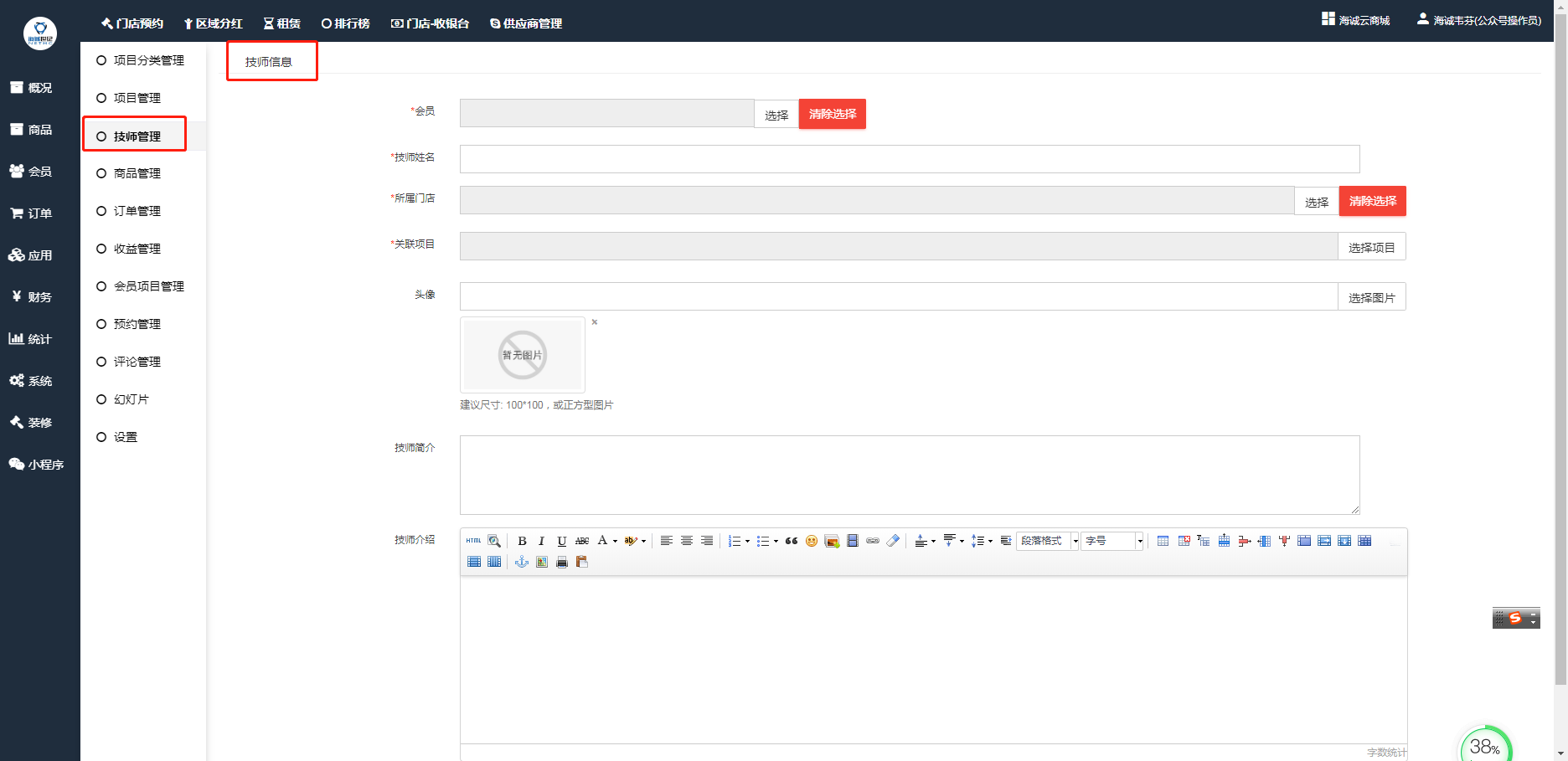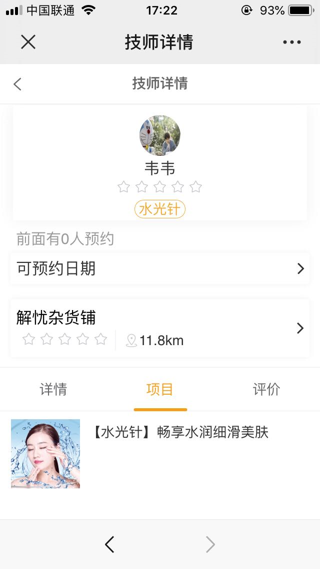 ## 技师头像、姓名、关联项目分类标签、评价星级、预约中的人数、可预约日期、服务门店信息(点击可跳转到门店首页)、门店距离、、技师介绍详情。