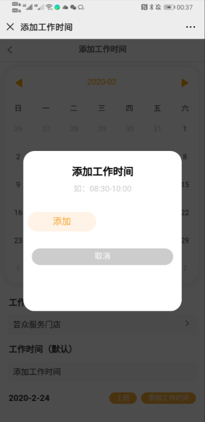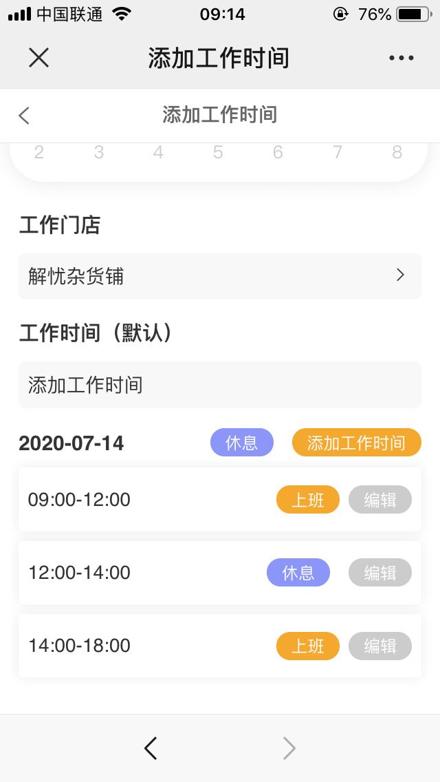 ## **添加工作时间(默认)—编辑工作时间**,可添加多个默认工作时间段,如8:00-12:00,14:00-18:00。