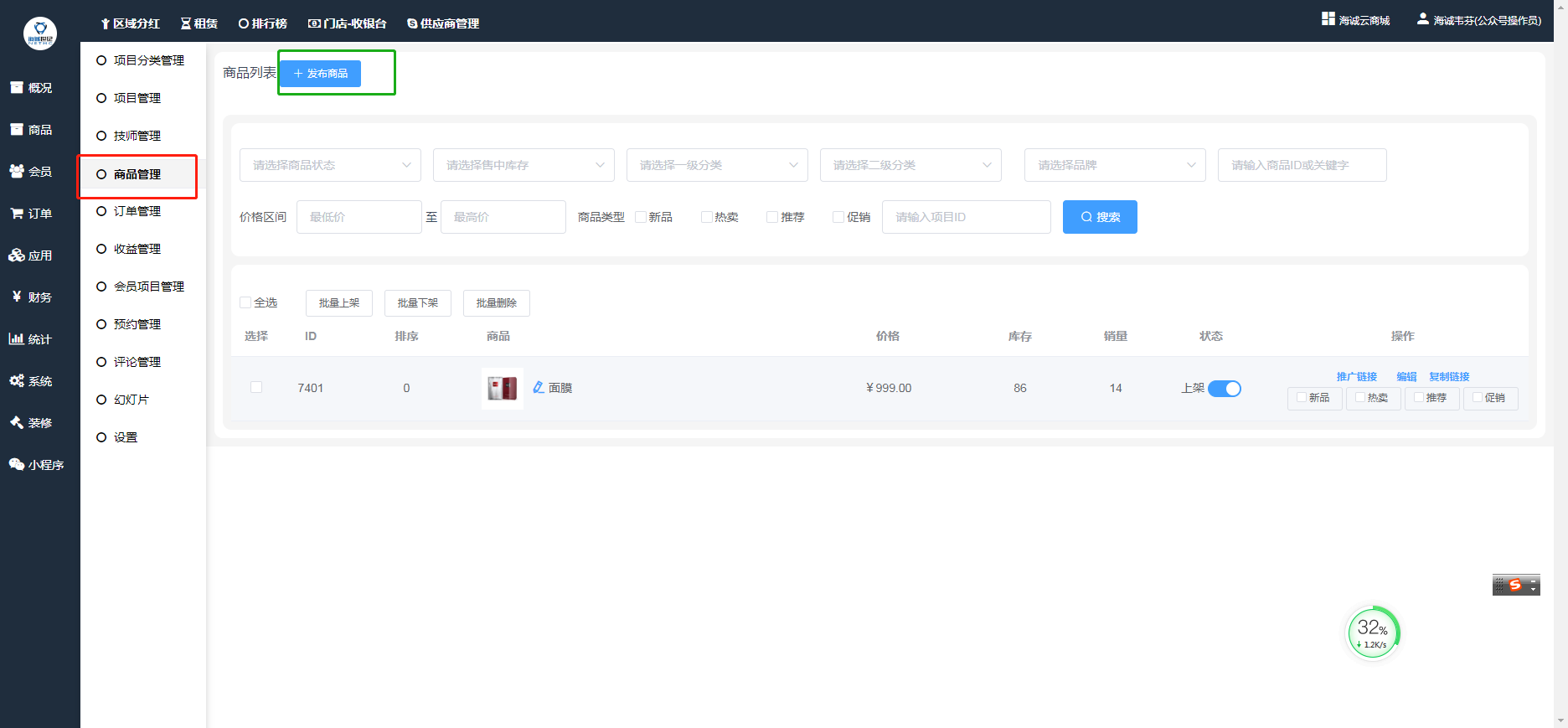 ## **门店预约—项目管理** 中可以发布商品,对商品的上下架、基本信息、营销方式的内容进行编辑,后台截图: