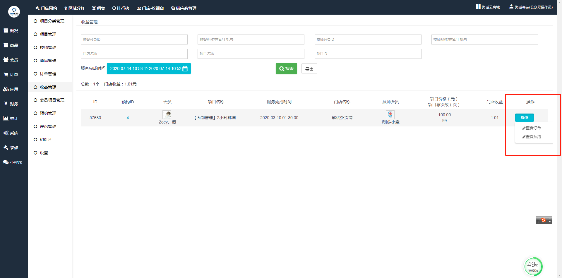 ## 会员预约---到店进行服务--服务完成技术核销预约记录--完成一次预约--门店获得该次项目服务收益结算。