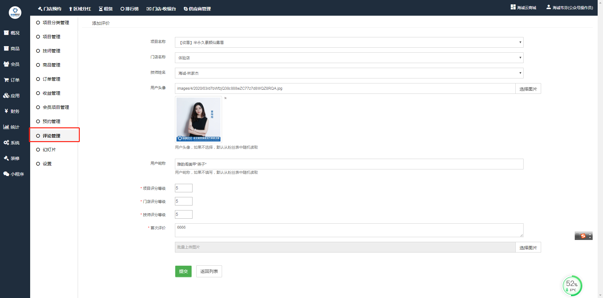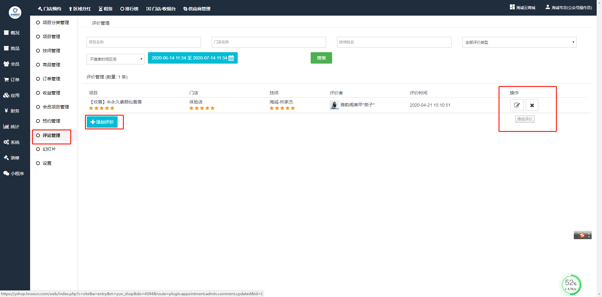 # :-: **门店预约-评论管理**