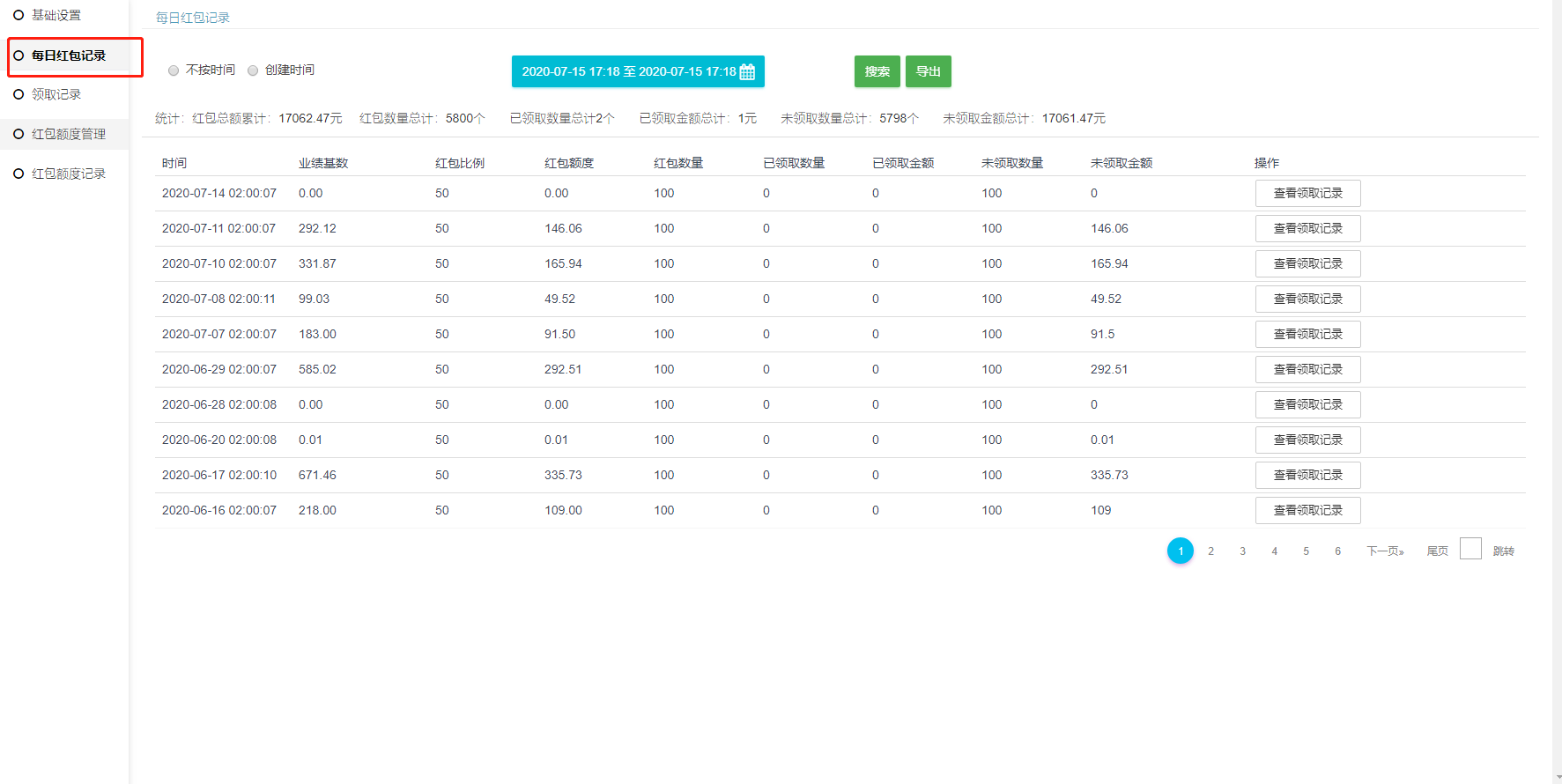 #### 每天凌晨两点自动产生红包记录,在这里页面可查看到红包对应的信息。