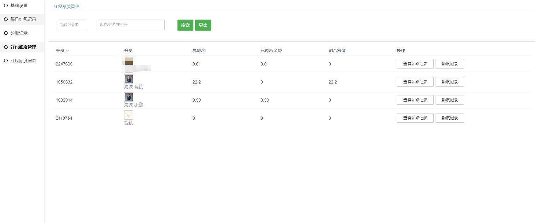 #### 在这个页面可点击查看该会员的领取记录和额度记录