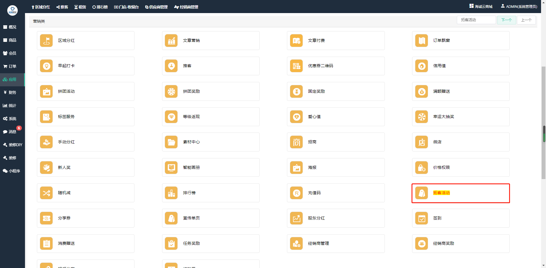 ## 一、登入云商城后台,点击应用,搜索**拓客活动**,点击进入