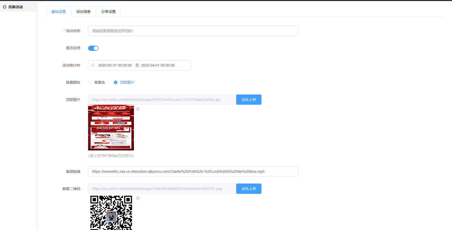 ## 填写好活动内容,并且把图片和音频文件以及客服二维码添加好,设置活动时间