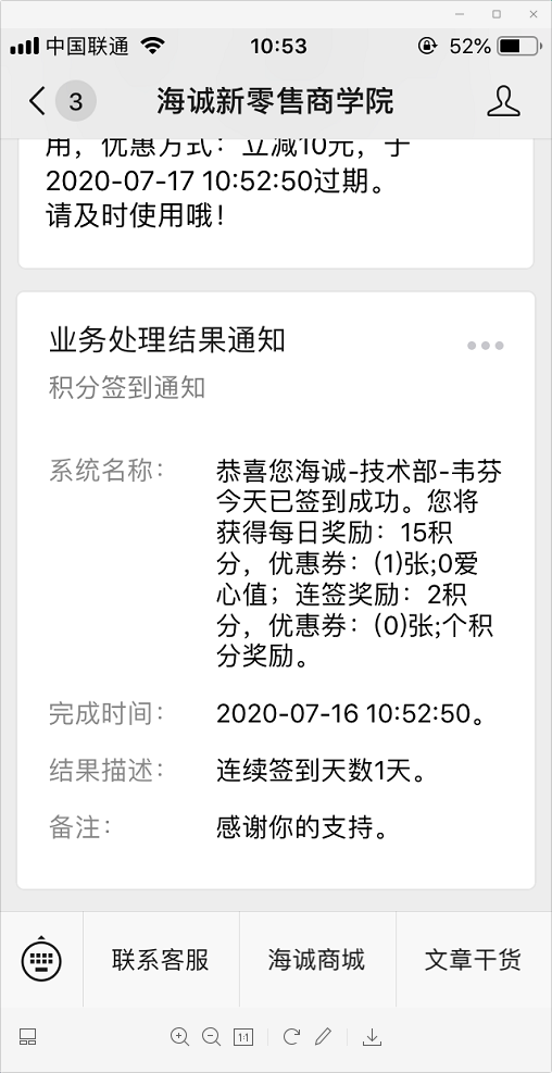 #### 签到完成签到时,公众号会弹出签到成功的通知信息。前提是需要创建自定义消息模板才行。