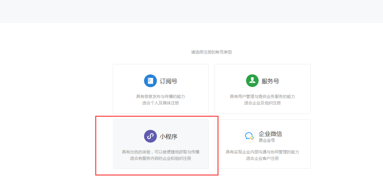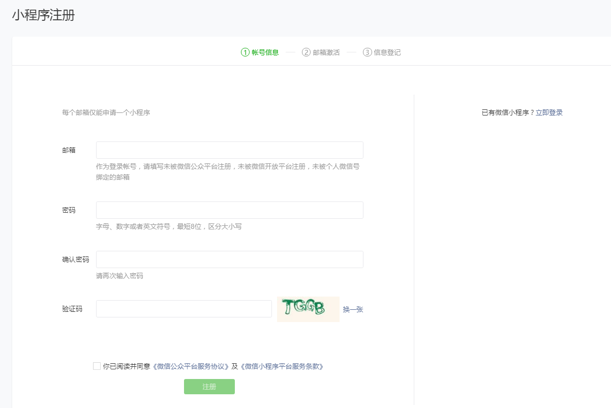 #### 注:注册的小程序主体必须要和微信公众号的一致;每个邮箱仅能申请一个小程序。通过原认证的公众号平台开通小程序,可免300元认证费,详情请看该论坛帖子:[https://bbs.yunzmall.com/forum.php?mod=viewthread&tid=347](https://bbs.yunzmall.com/forum.php?mod=viewthread&tid=347)