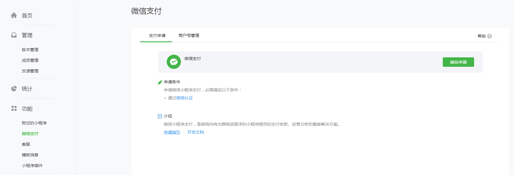 #### 4、下一步,建议申请小程序的微信支付(登录小程序平台mp.weixin.qq.com--微信支付--开通,可直接申请新微信支付,或绑定微信公众号的微信支付;若想要借用微信公众号的微信支付,详情请看该帖子:[https://bbs.yunzmall.com/forum.php?mod=viewthread&tid=976](https://bbs.yunzmall.com/forum.php?mod=viewthread&tid=976))