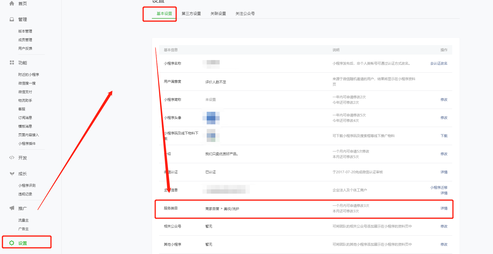 #### 1)装修之前,检查小程序选择的服务类目(小程序平台mp.weixin.qq.com -- 设置 -- 基础信息 -- 服务类目)。比如小程序服务类目是商家自营-美妆/洗护,那么小程序原生首页装修请务必只添加关于美妆/洗护的商品。