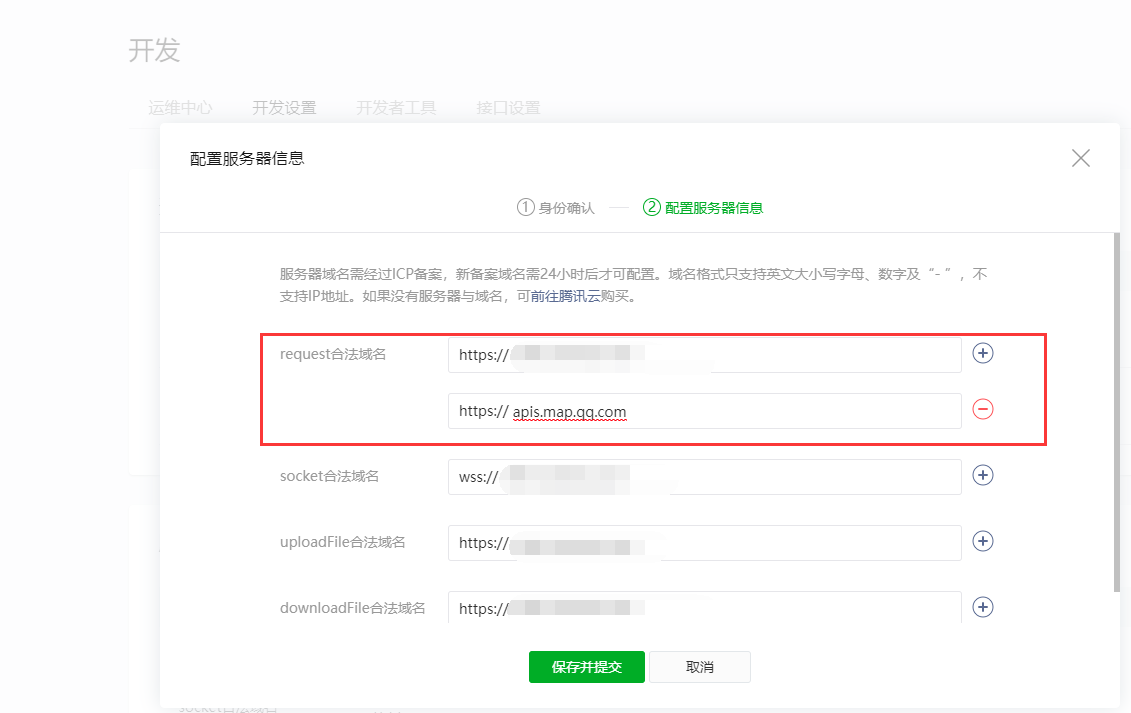 #### 注:商城有使用门店收银台功能,请务必在服务器域名配置 ==》 request合法域名除了添加商城域名外,多添加一个定位域名:apis.map.qq.com,才可以使用定位功能。如下图