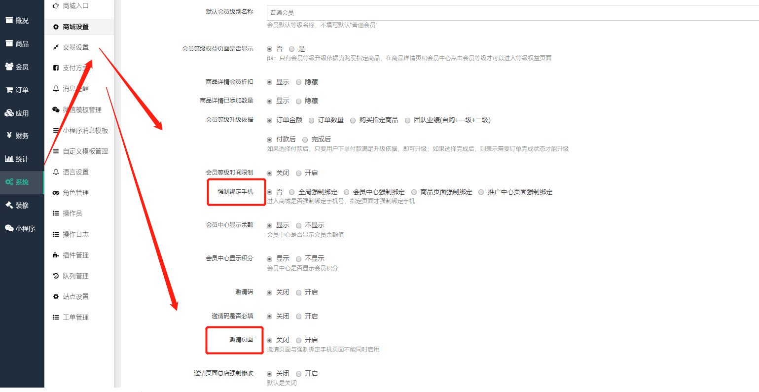 #### 6)后台系统--商城设置--会员设置--关闭强制绑定手机和邀请页面。