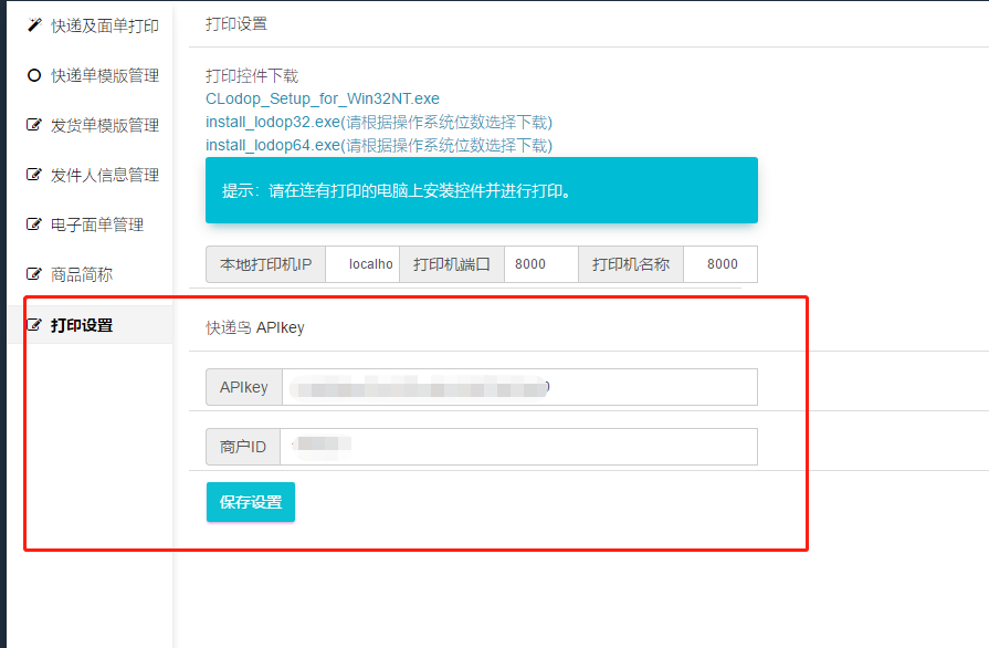 ## 1)首先快递助手基础打印设置,填写快递鸟的商户ID和APIkey。如下图: