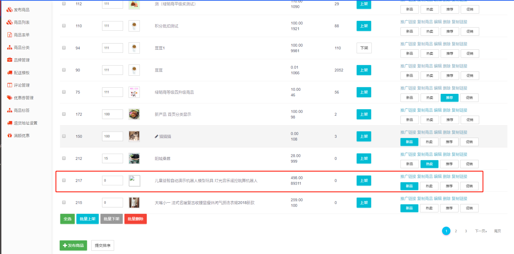 #### 支持任意云商城系统的商品导入,导入的商品会显示在商品列表,商家可对其进行上下架或信息修改