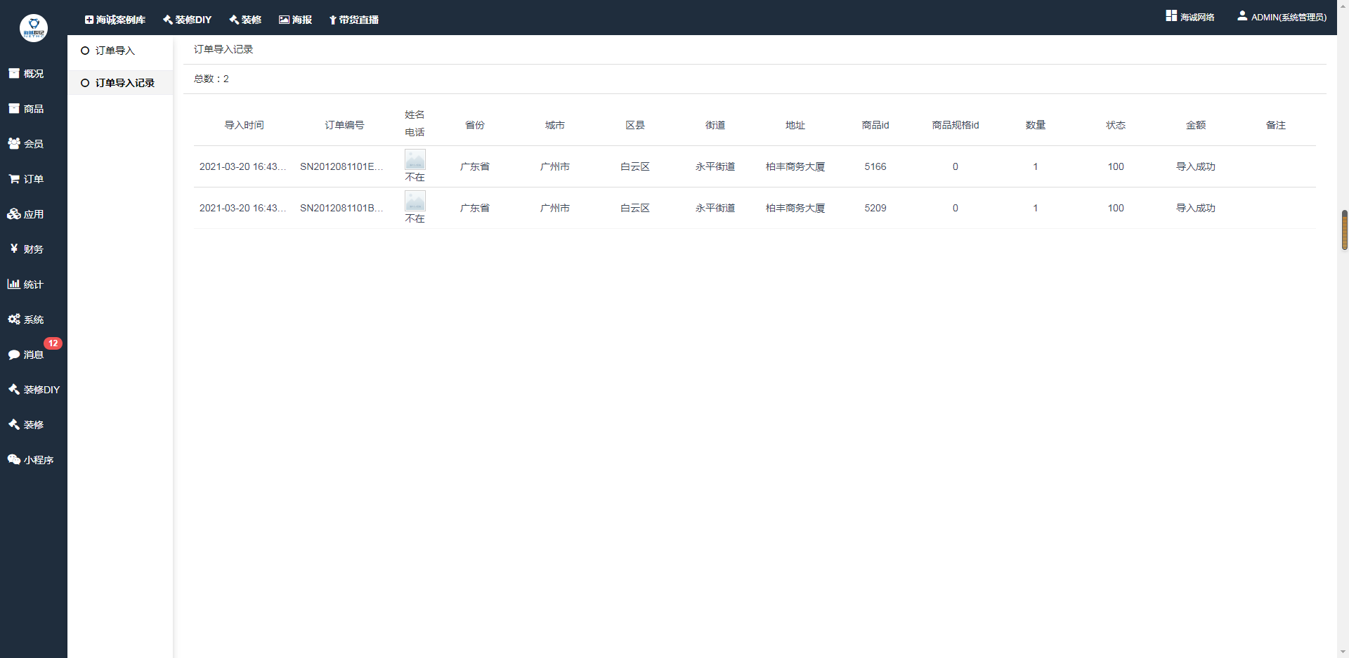 4. 导入后在订单管理中即可看到导入的订单;在订单导入插件-订单导入记录中可以看到导入的记录信息
