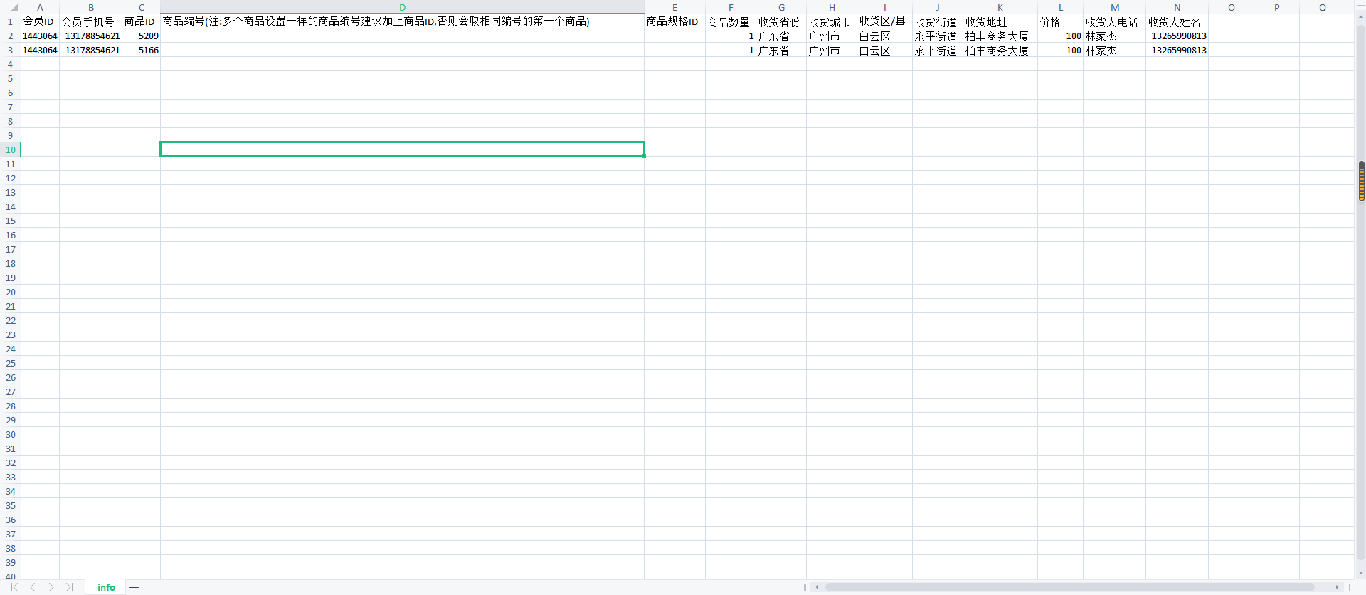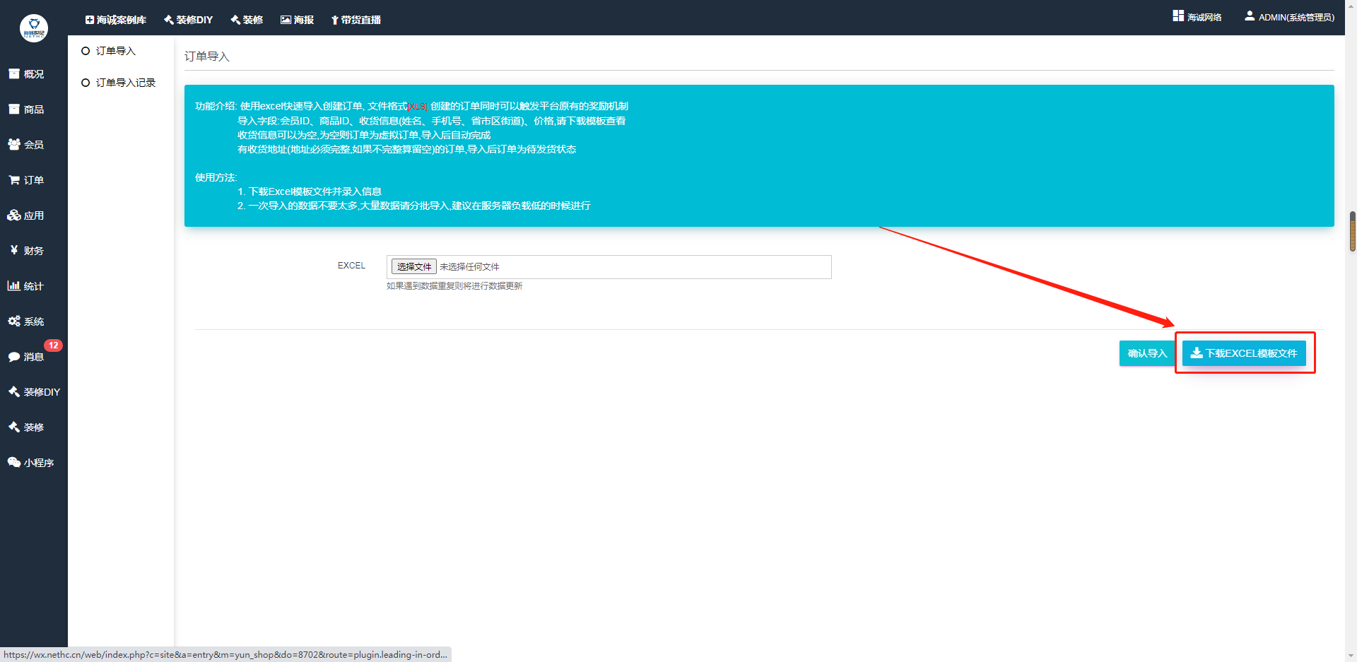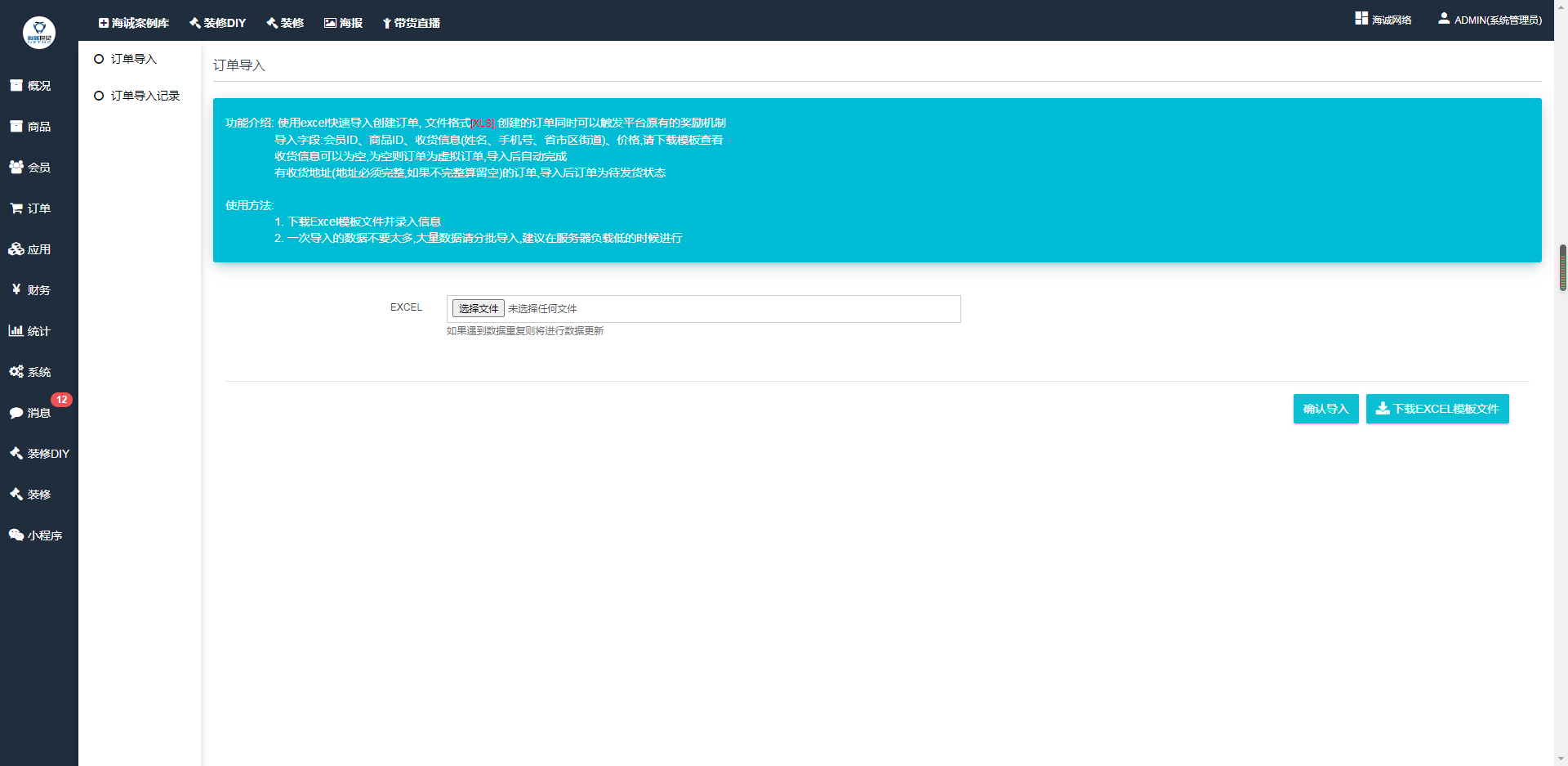 ## 使用excel快速导入创建订单, 文件格式\[XLS\],创建的订单同时可以触发平台原有的奖励机制导入字段:会员ID、商品ID、收货信息(姓名、手机号、省市区街道)、价格,请下载模板查看收货信息可以为空,为空则订单为虚拟订单,导入后自动完成有收货地址(地址必须完整,如果不完整算留空)的订单,导入后订单为待发货状态
