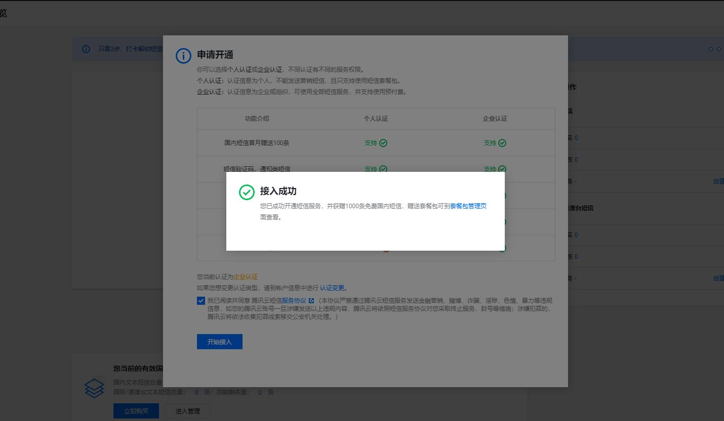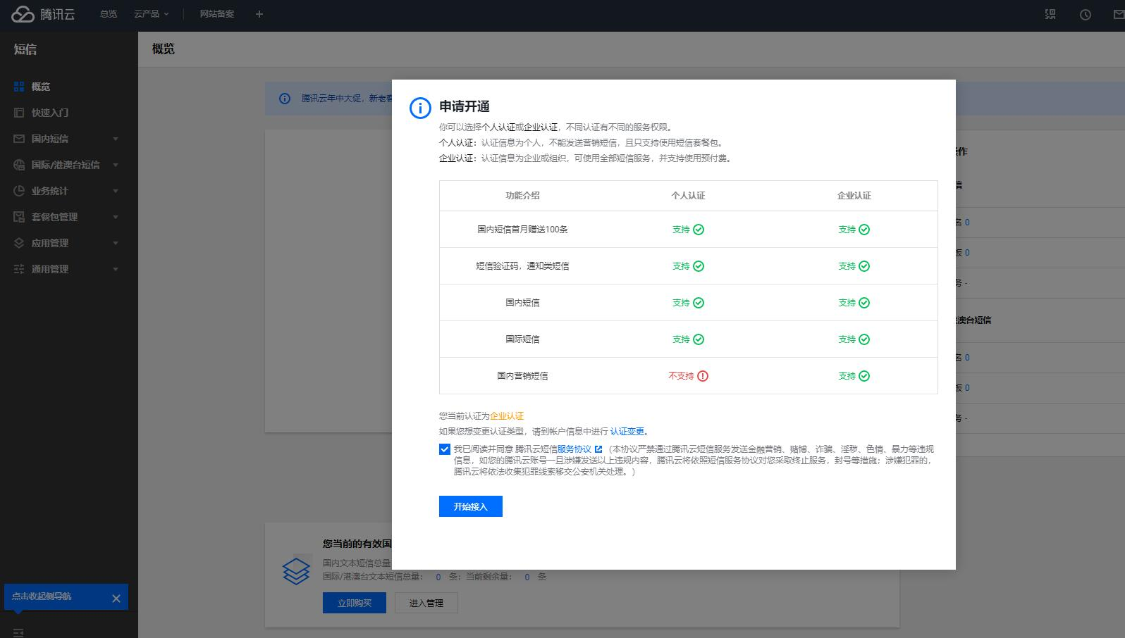 ## **二**、免费开通短信,前提须通过个人认证或企业认证。