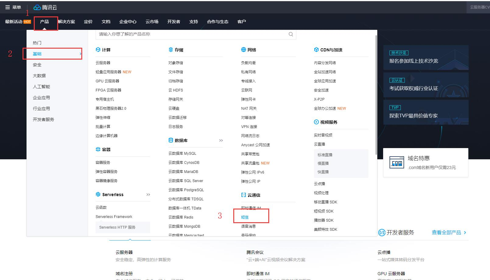 ## **一**、登录腾讯云控制台 >> 短信,您会进入到这个页面,[https://cloud.tencent.com/product/sms](https://cloud.tencent.com/product/sms)