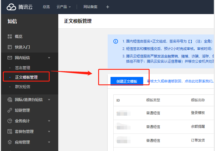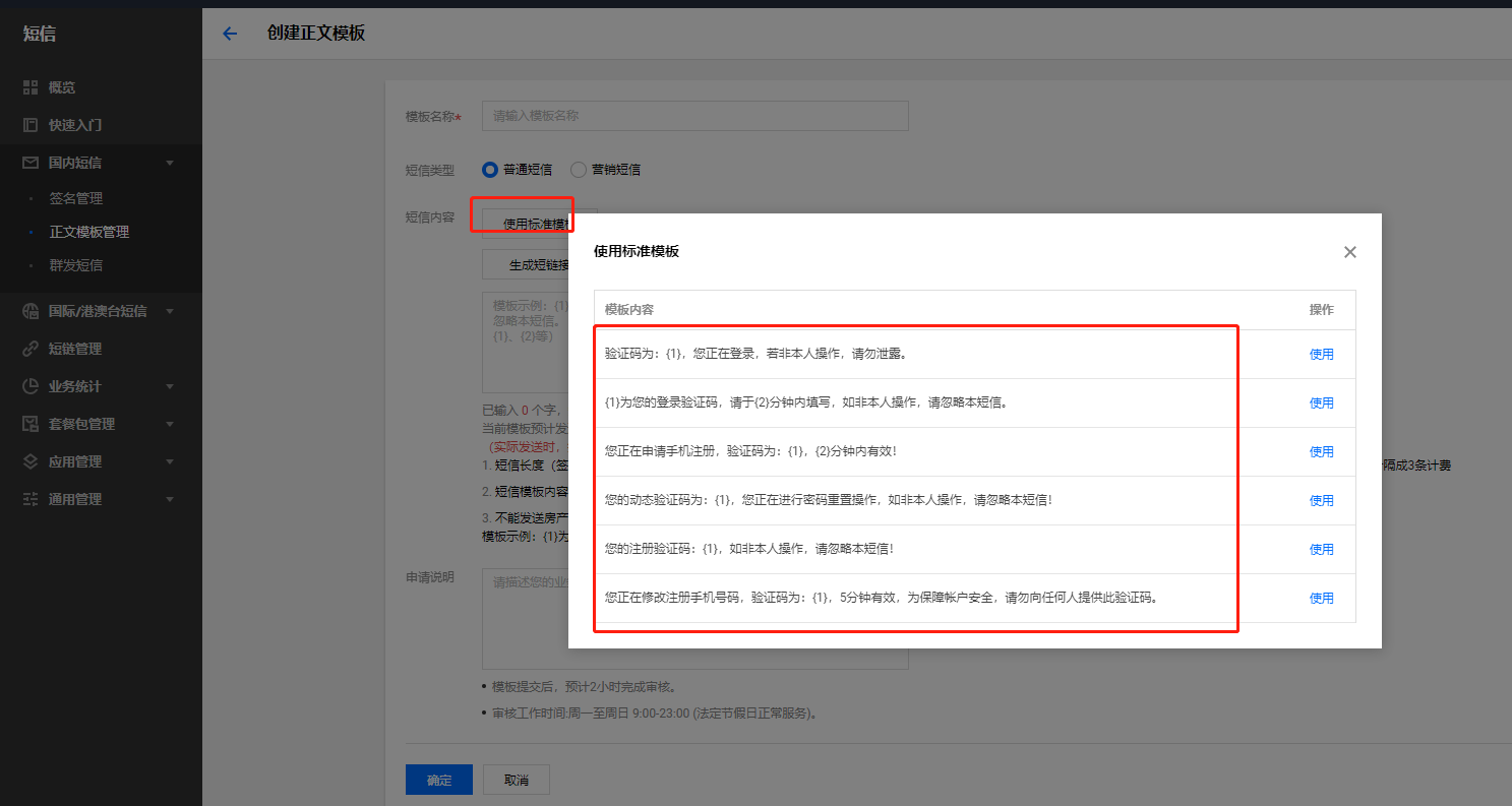 ## 4、短信模板内容,例:{1}为您的登录验证码,请于{2}分钟内填写。如非本人操作,请忽略本短信。其中{1}为验证码,{2}为有效时间。({1}、{2}为可自定义的内容,须从1开始连续编号,如{1}、{2}等)具体短信内容可以自由发挥,但是验证码和有效期分钟的地方,一定要用{1}{2}来代替。否则模板没用。