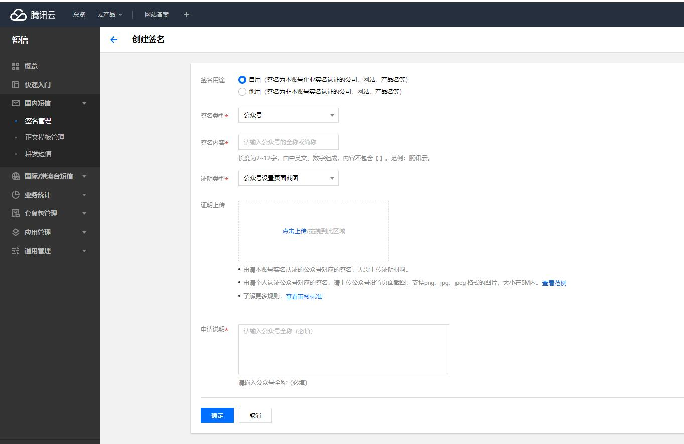 ## **申请说明:**公司类型,可参考填写用于短信注册验证码;网站类型,必填网站域名;公众号类型,必填公众号名称。其余类型按要求填写。