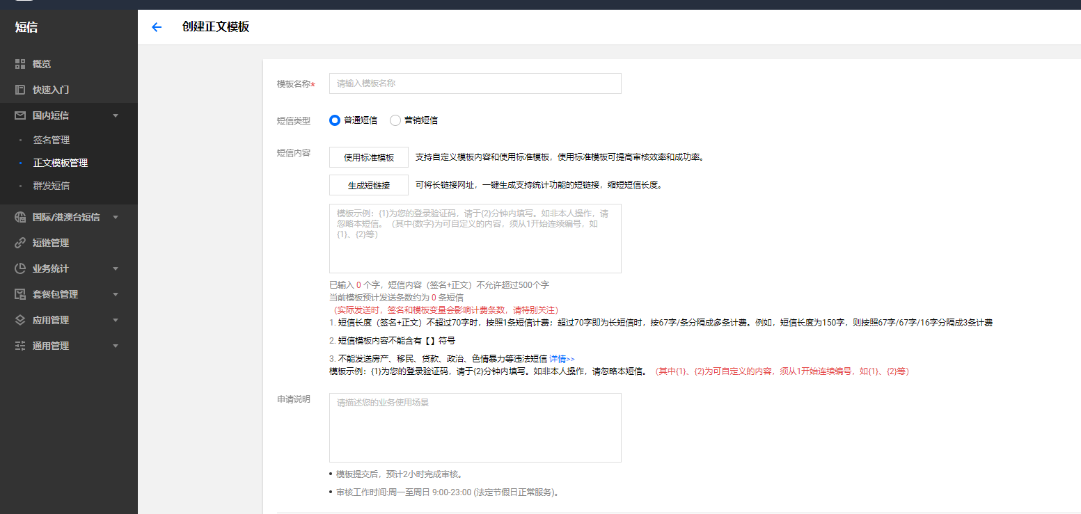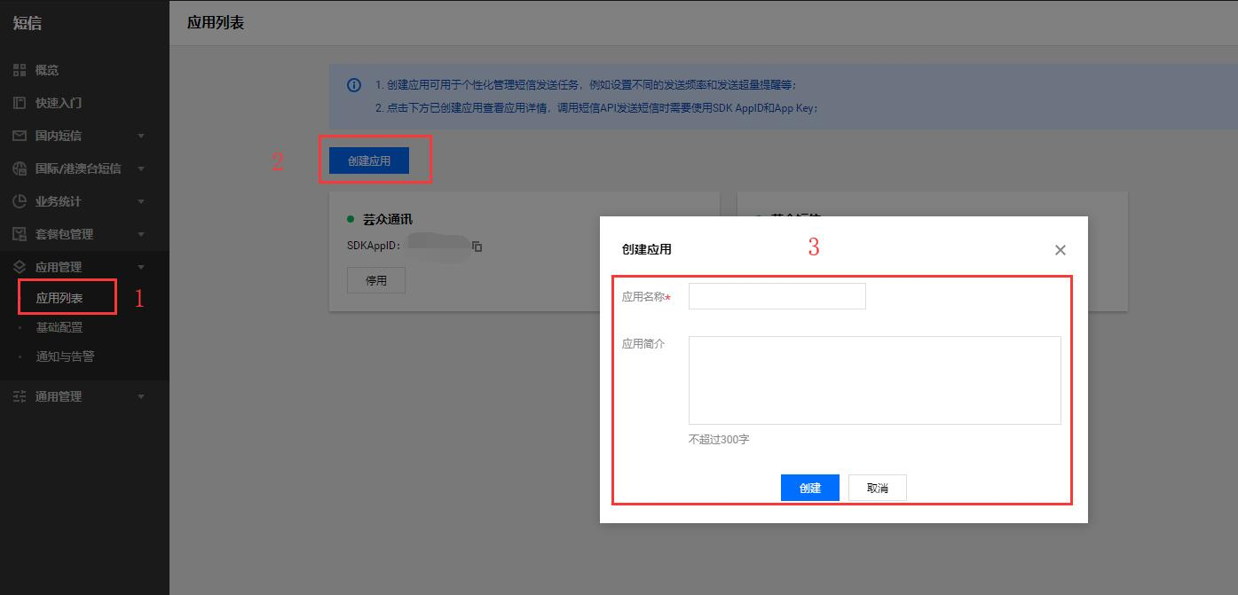 ## 3、申请说明:按自己需求填写。例如:若是用于注册登录,那参考填写用于发送短信注册验证码。