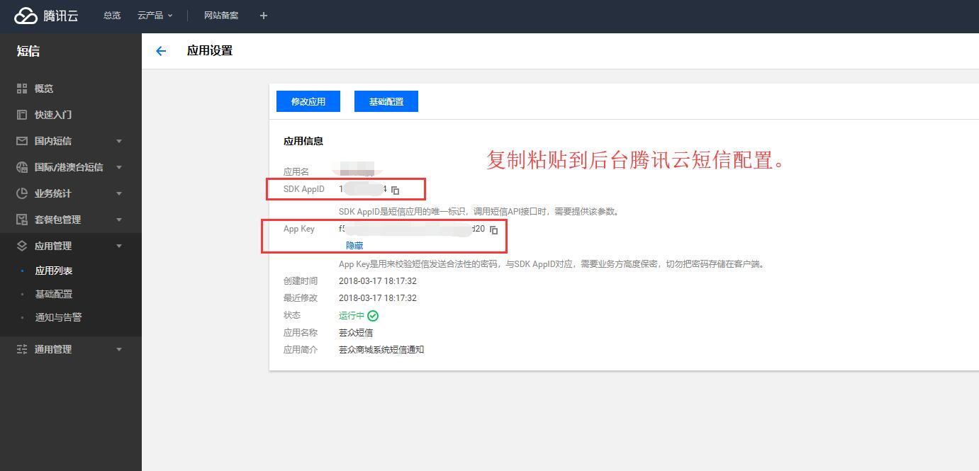 ## 创建好后,进入应用详情,复制SDKAppID和AppKey粘贴到后台。