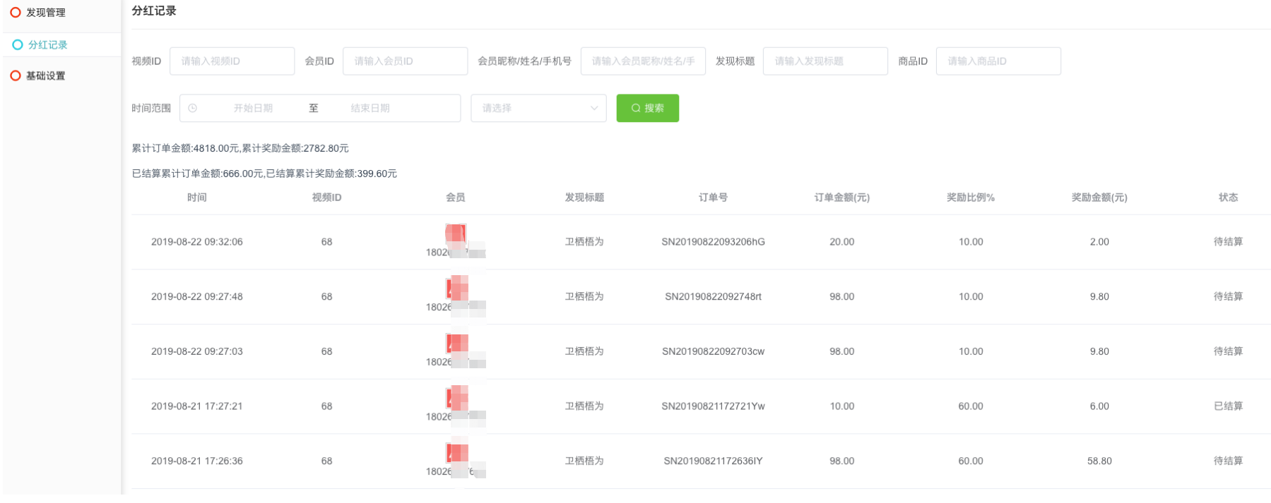 #### 1, 会员获得奖励就会有一条奖励记录,会员下单就会产生记录,订单完成奖励状态变为已结算。