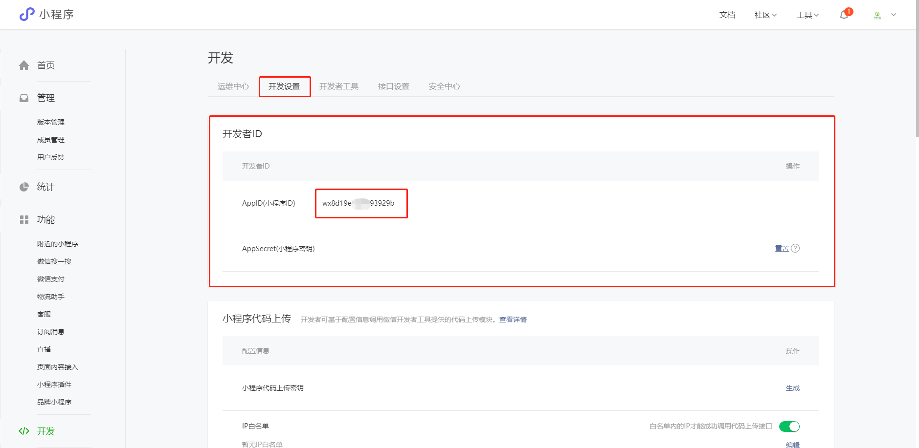 ## 3.点击 **“开发设置”,复制“AppID(小程序ID)、AppSecret(小程序密钥)”** 参数。