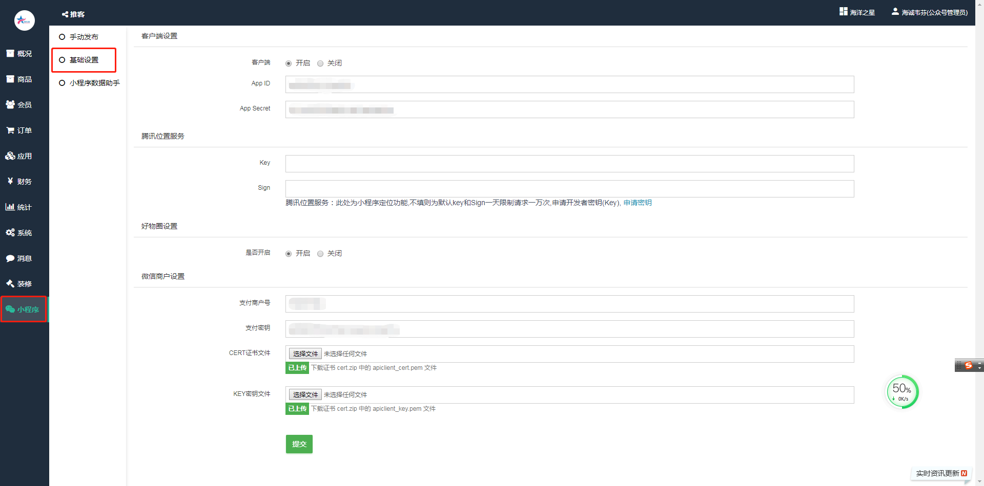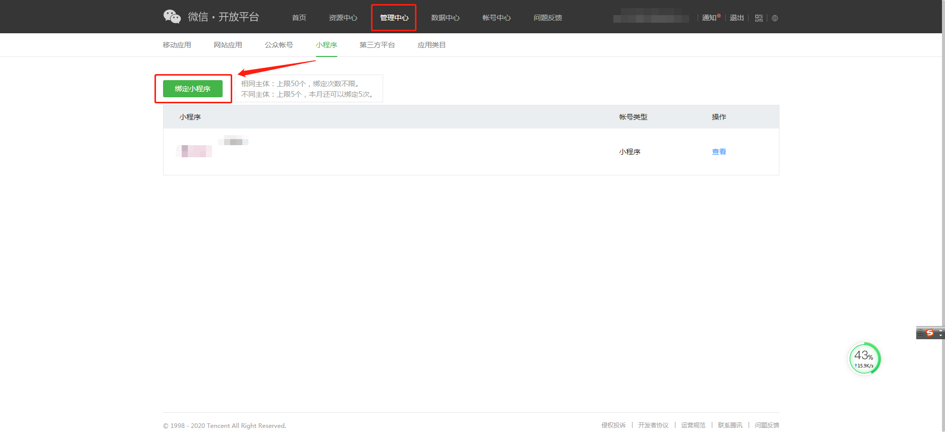 ### 3、小程序支持与微信商城数据同步。同步之前第一步需确保您注册并认证好微信开放平台(网址:open.weixin.qq.com),且开放平台管理中心已绑定好公众号和小程序。同步第二步说明请看下方关于提交小程序审核的介绍。